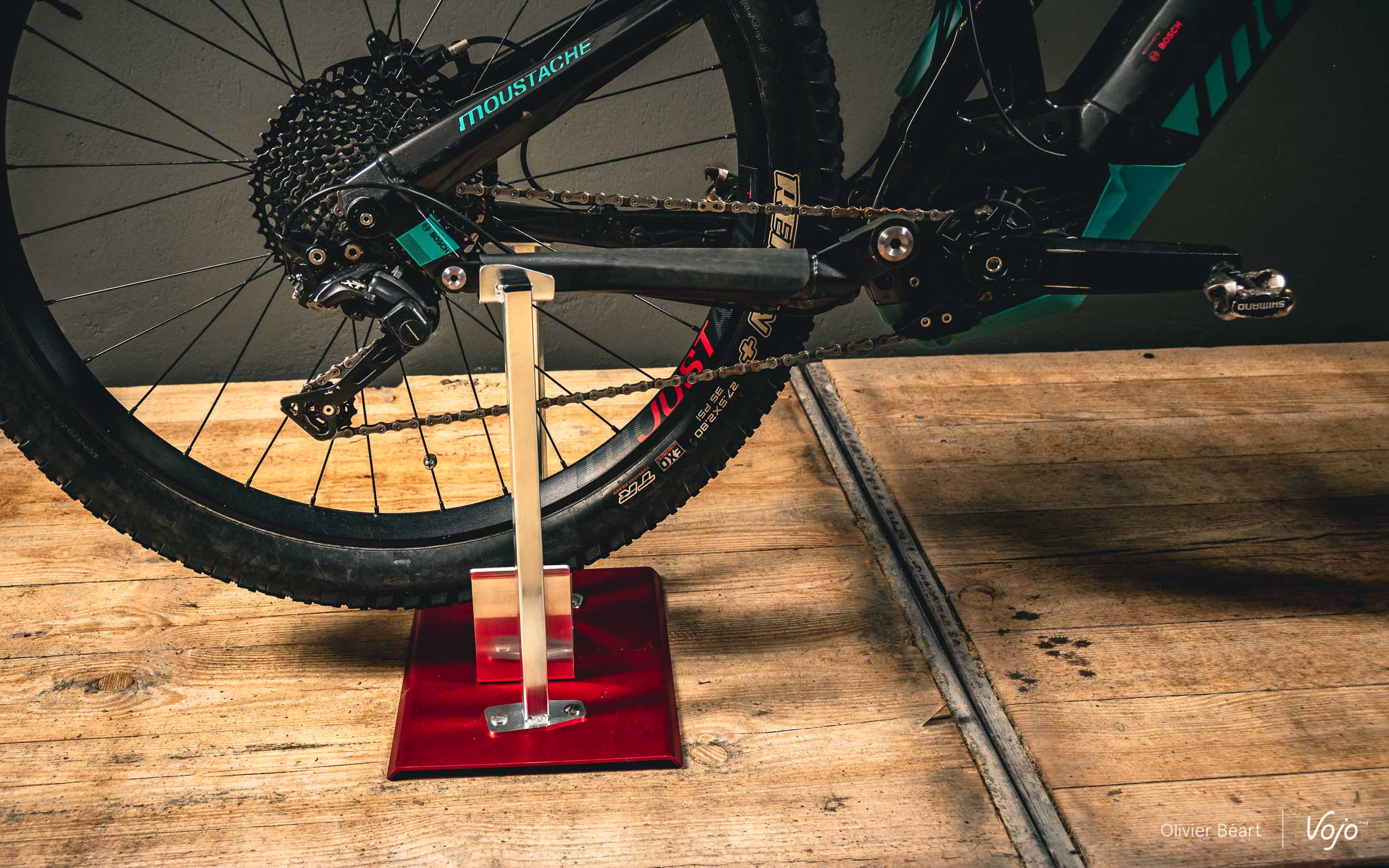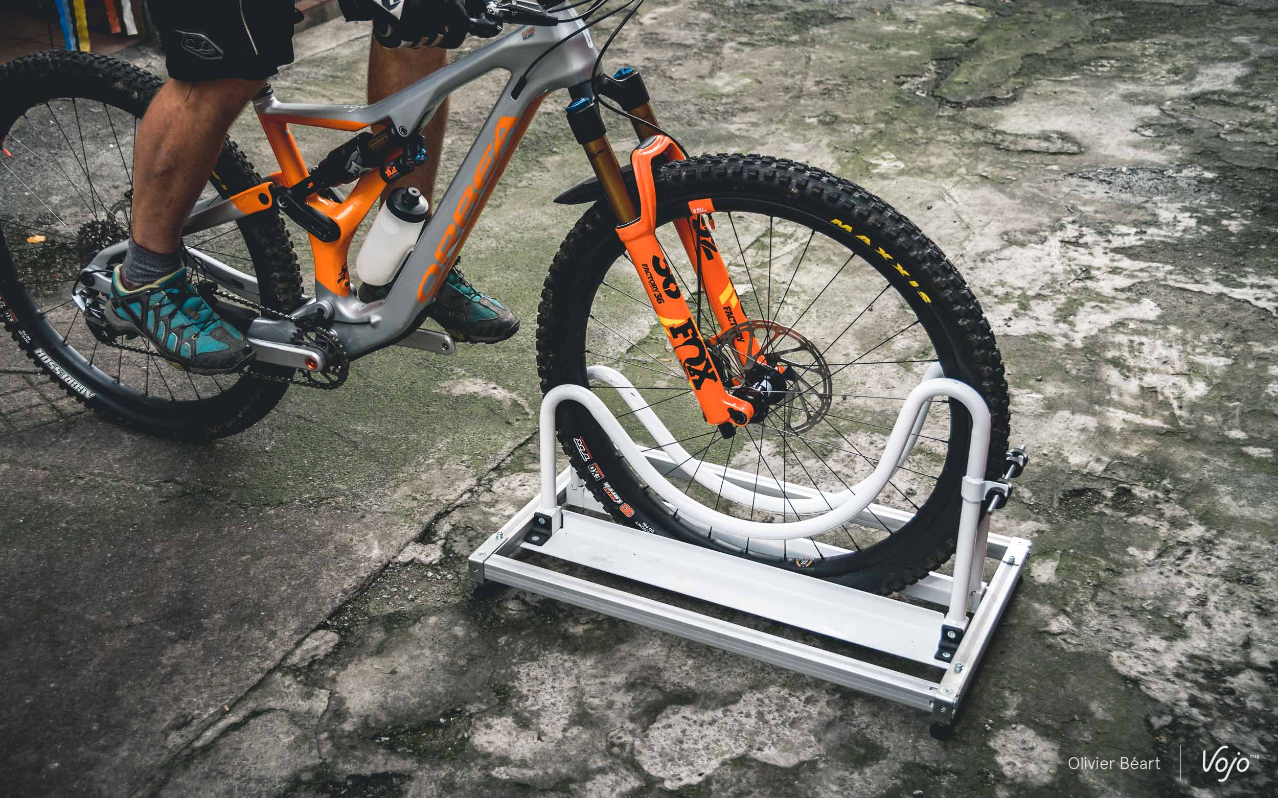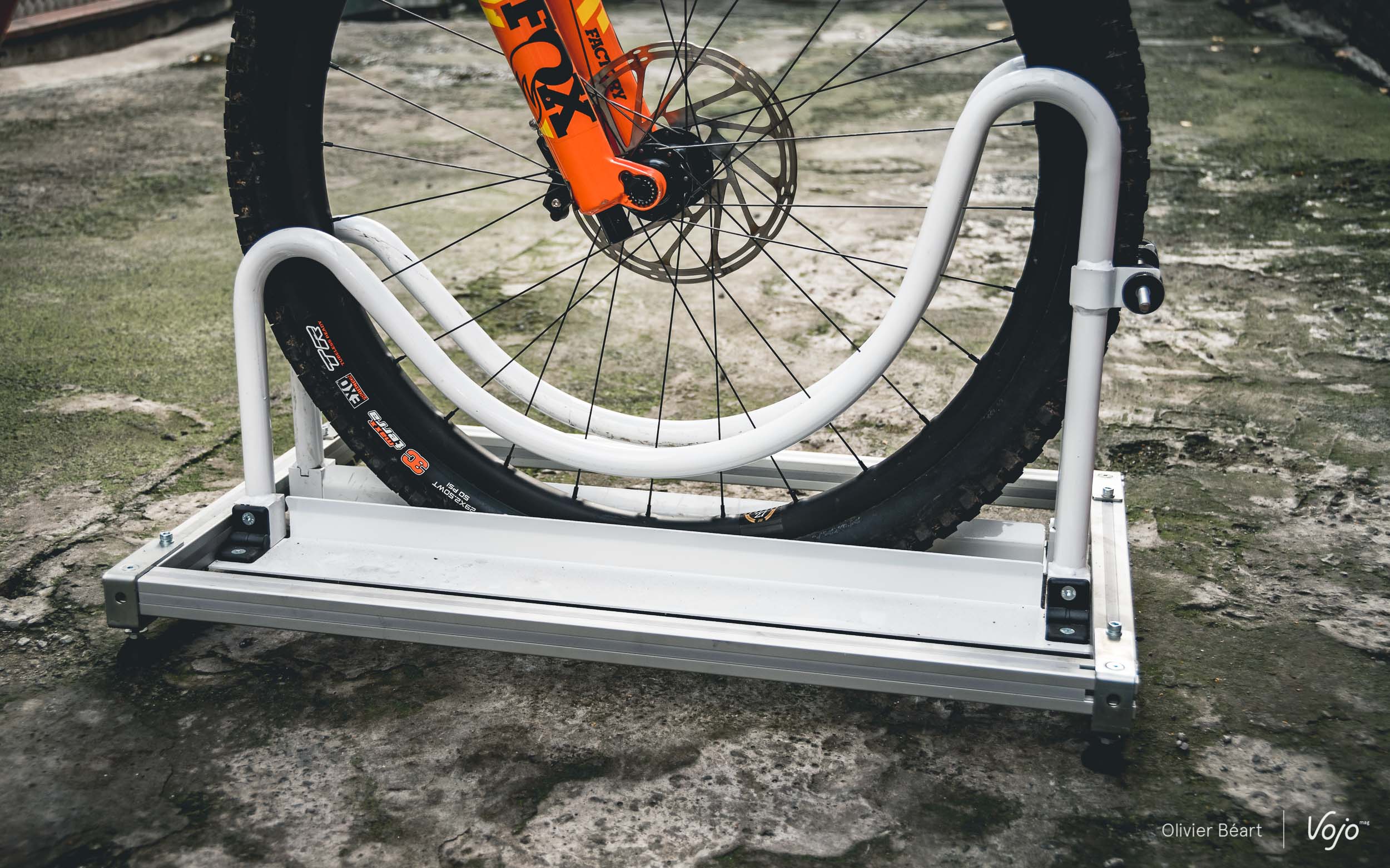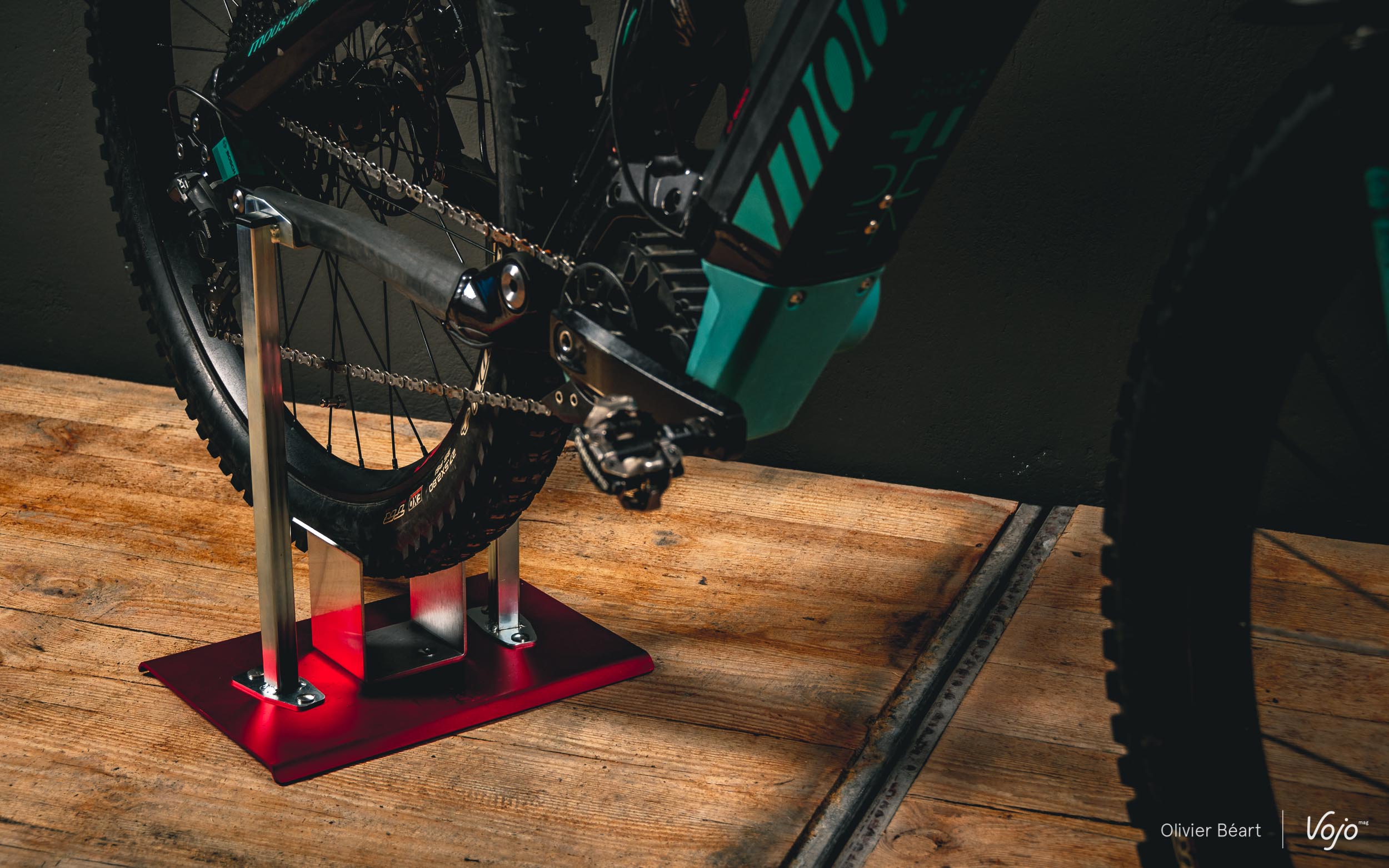 L’idée est de placer la roue avant dans le pied et, grâce à sa base large, ainsi qu’aux deux grands tubes qui enserrent la roue avant, de permettre au vélo et au biker de tenir en équilibre tout seul, ce qui permet au professionnel d’effectuer, par exemple, les réglages de suspension (SAG,…)