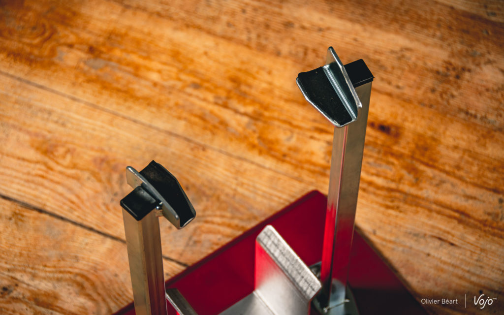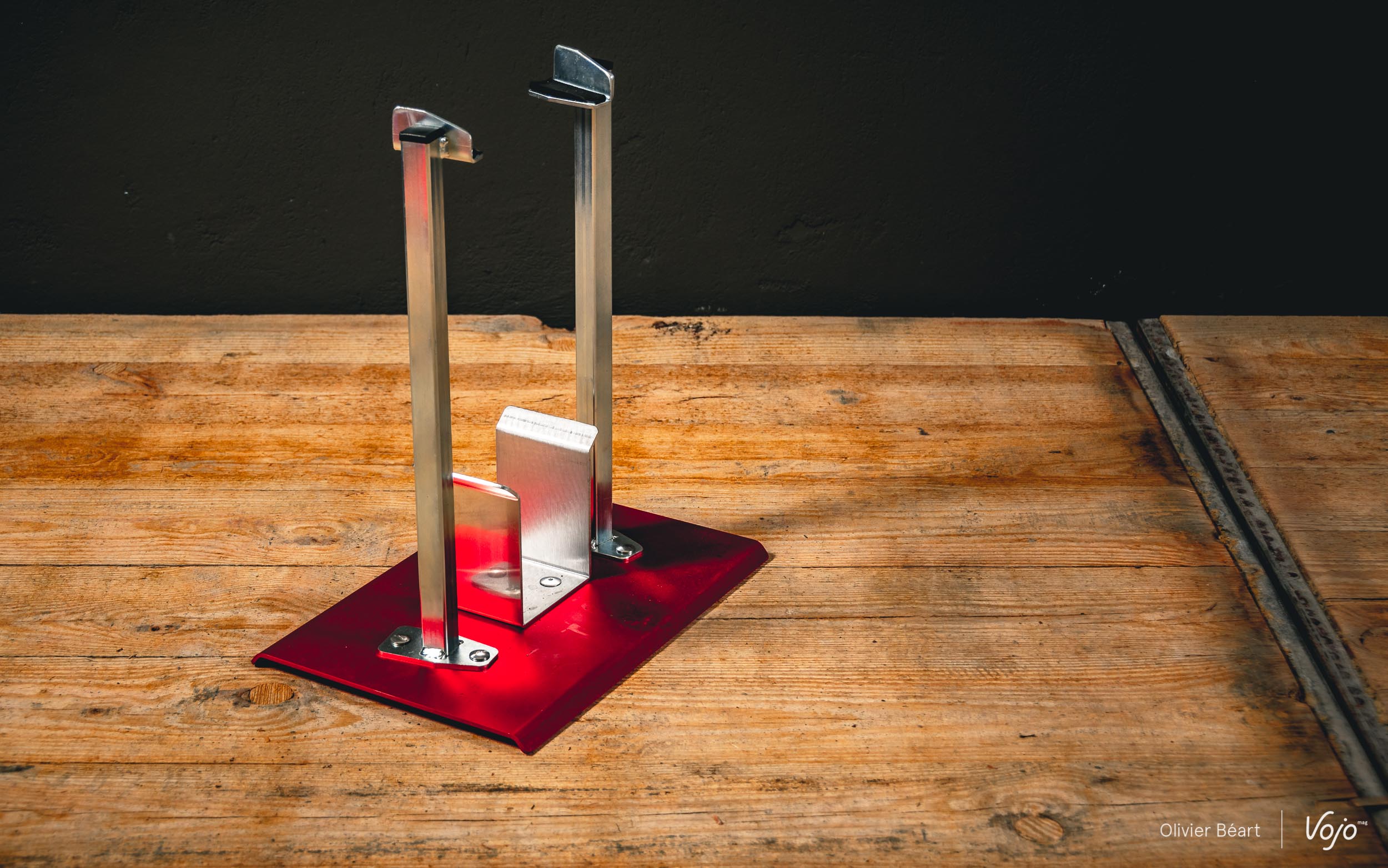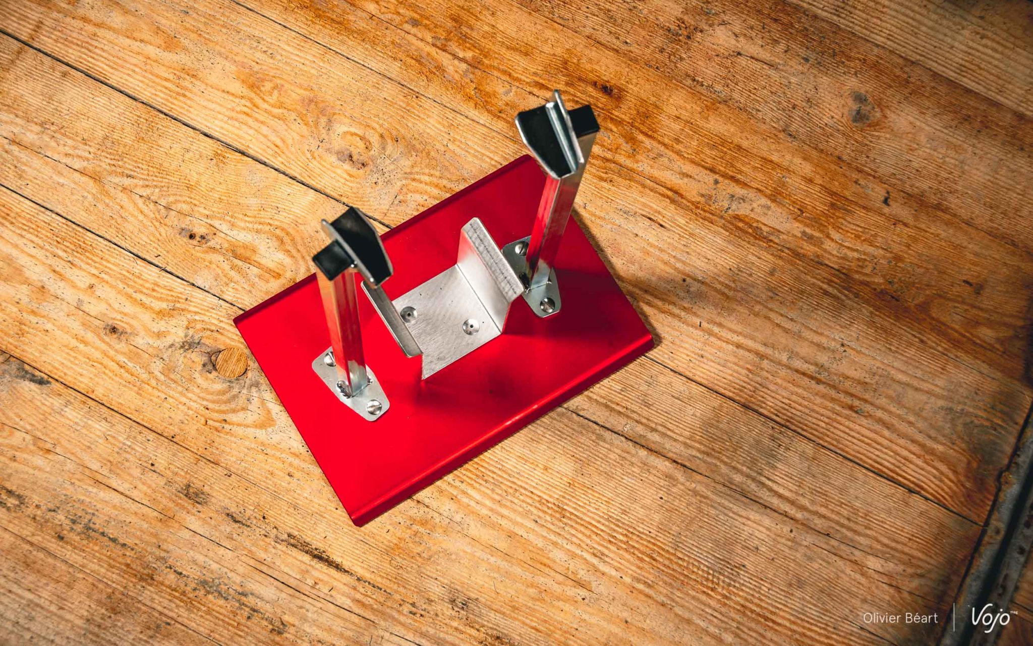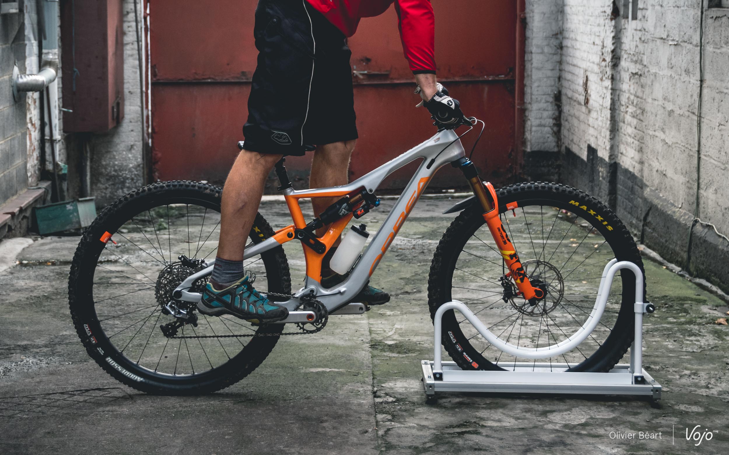 L’idée est de placer la roue avant dans le pied et, grâce à sa base large, ainsi qu’aux deux grands tubes qui enserrent la roue avant, de permettre au vélo et au biker de tenir en équilibre tout seul, ce qui permet au professionnel d’effectuer, par exemple, les réglages de suspension (SAG,…)