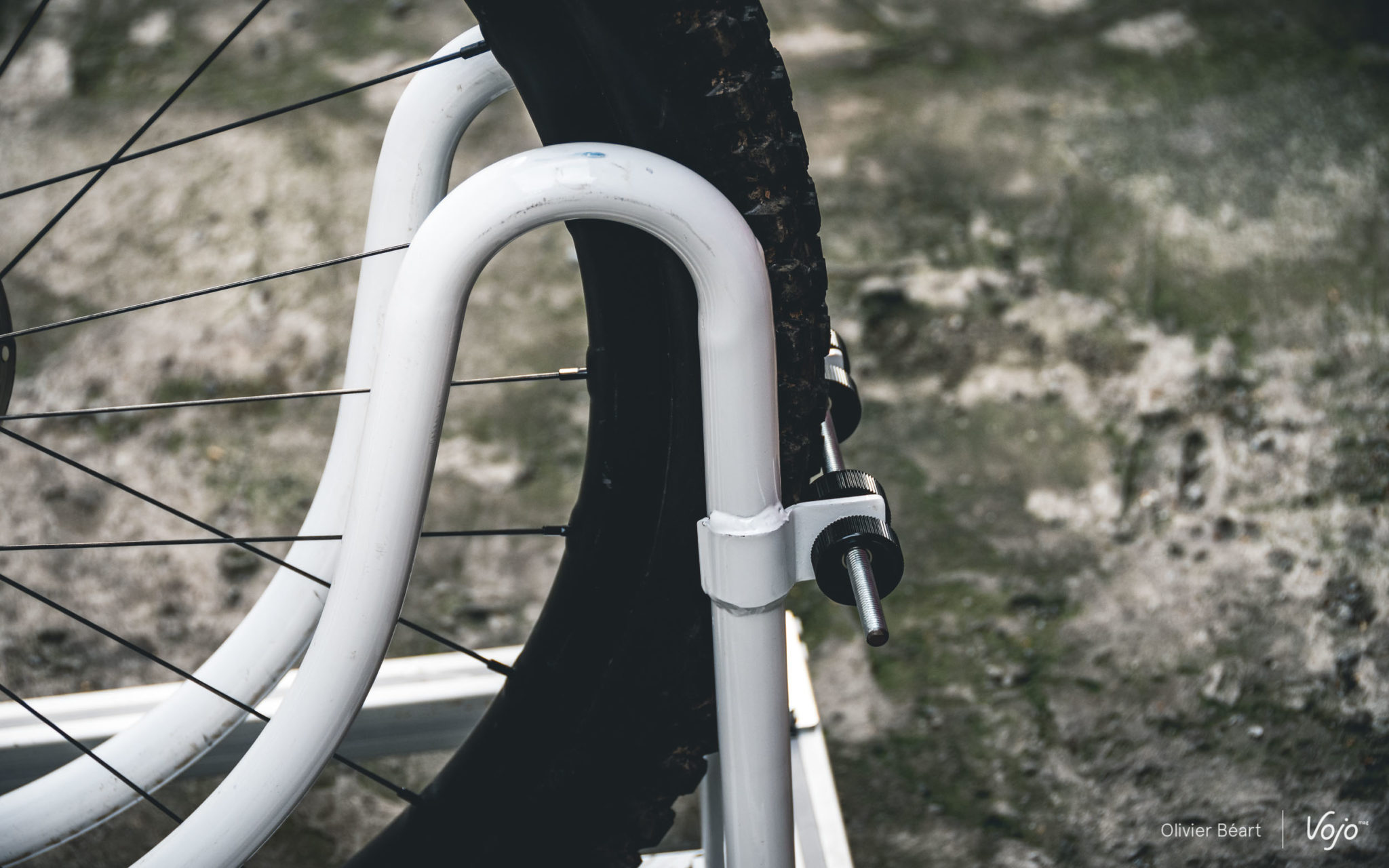 Specialized équipe ses magasins d’un dispositif similaire, mais celui présenté ici présente quelques caractéristiques propres, comme le fait qu’il est pliable, ou encore qu’il s’adapte à différentes largeurs de roues grâce à une mollette qui permet de régler l’écartement entre les deux « mâchoires ».