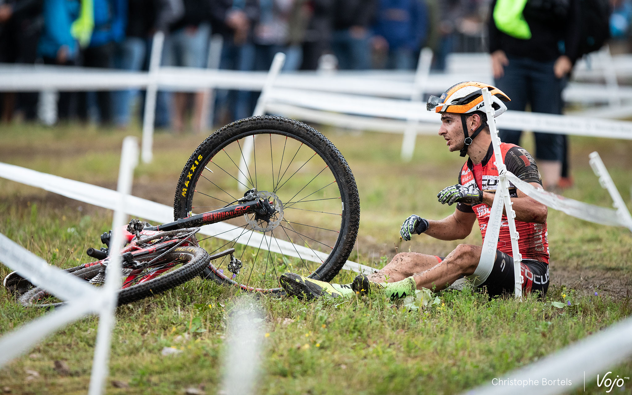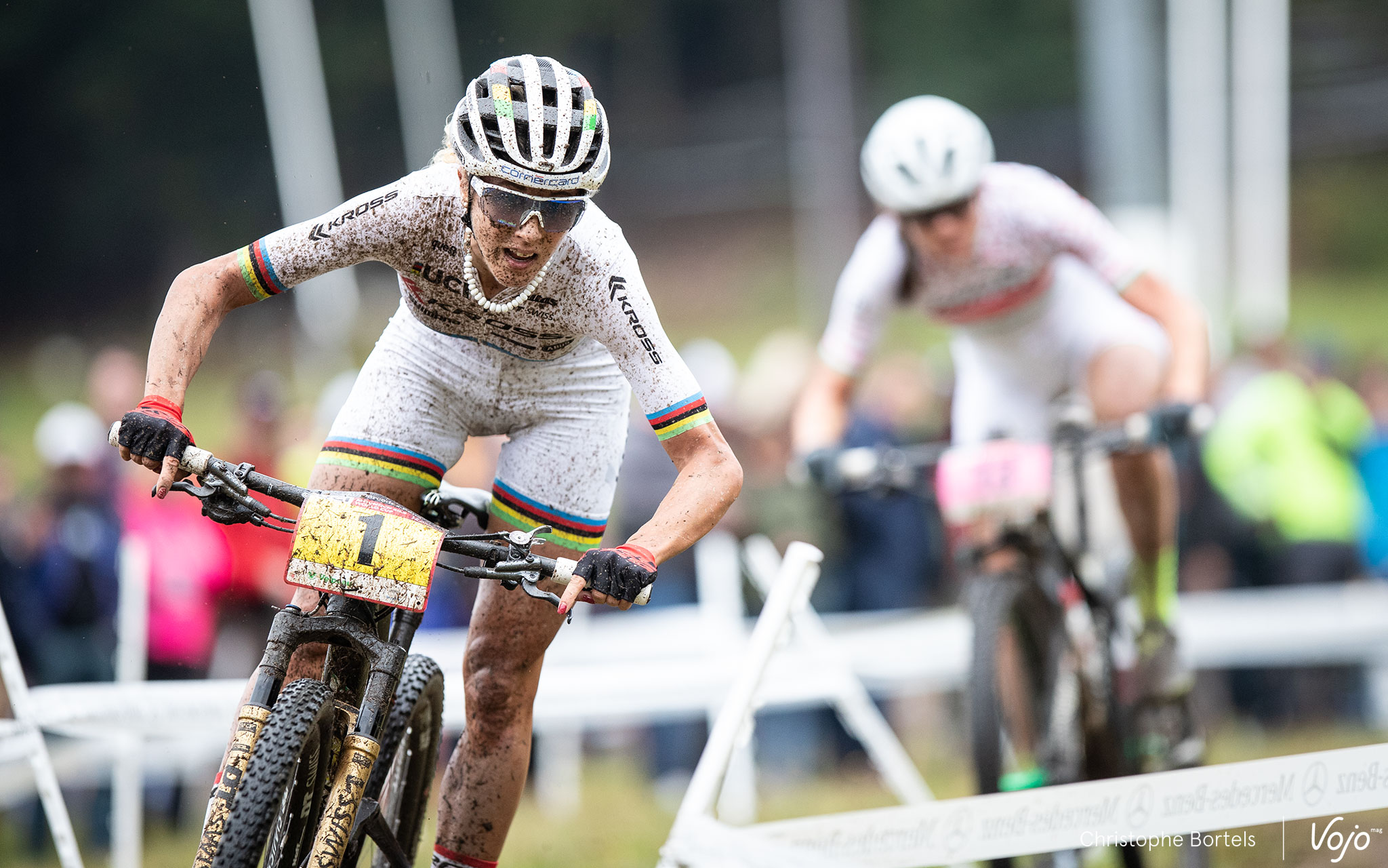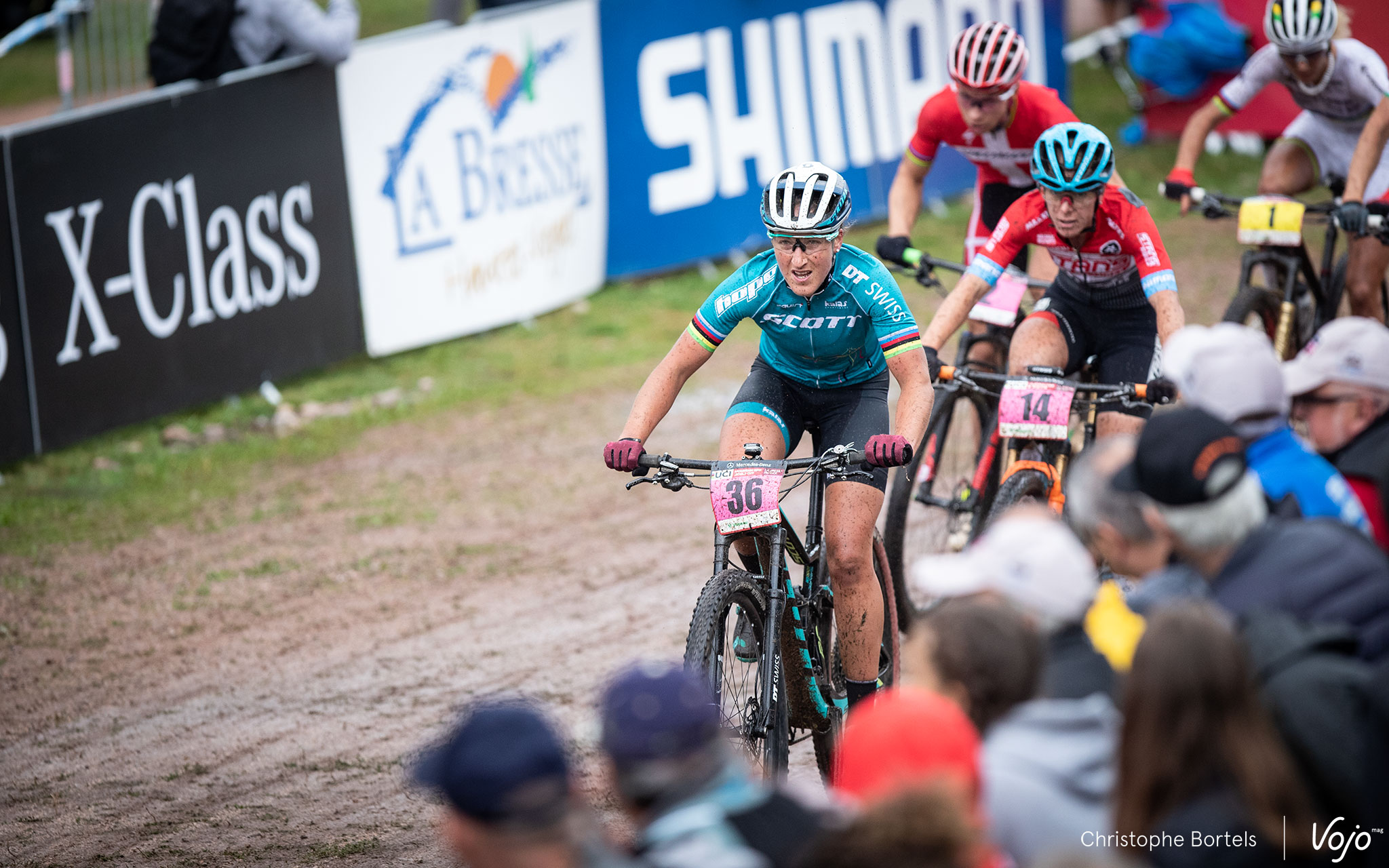 Un circuit court, quelques tours et moins de 25 minutes de course, c’est toujours la garantie d’épreuves super nerveuses et indécises. Ce fut encore le cas à La Bresse ce vendredi en fin d’après-midi. Et parfois ça frotte et ça chute, comme ici Kate Courtney qui accroche des barrières dans le 2e tour et mordra la poussière dans la foulée. Elle termine 15e, tout juste pour intégrer la 2e ligne dimanche.