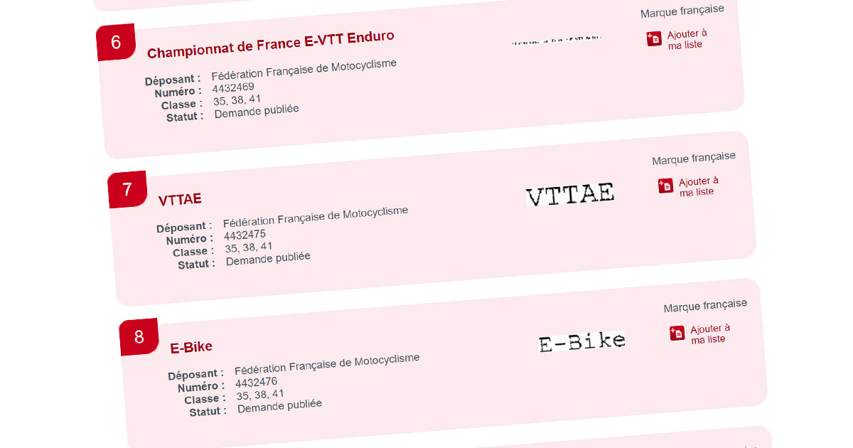 Mais la FFM, qui a déjà montré à plusieurs reprises sa proactivité et ses bonnes connaissances juridiques, a décidé d’attaquer sur un autre terrain, comme l’ont découvert nos confrères de Vttae.fr qui ont été les premiers à s’apercevoir que la FFM (fédé moto, donc) avait introduit plusieurs demandes auprès de l’INPI afin d’obtenir des droits de propriété intellectuelle sur toute une série de termes liés à la pratique du vélo électrique (vttae, e-bike, etc).