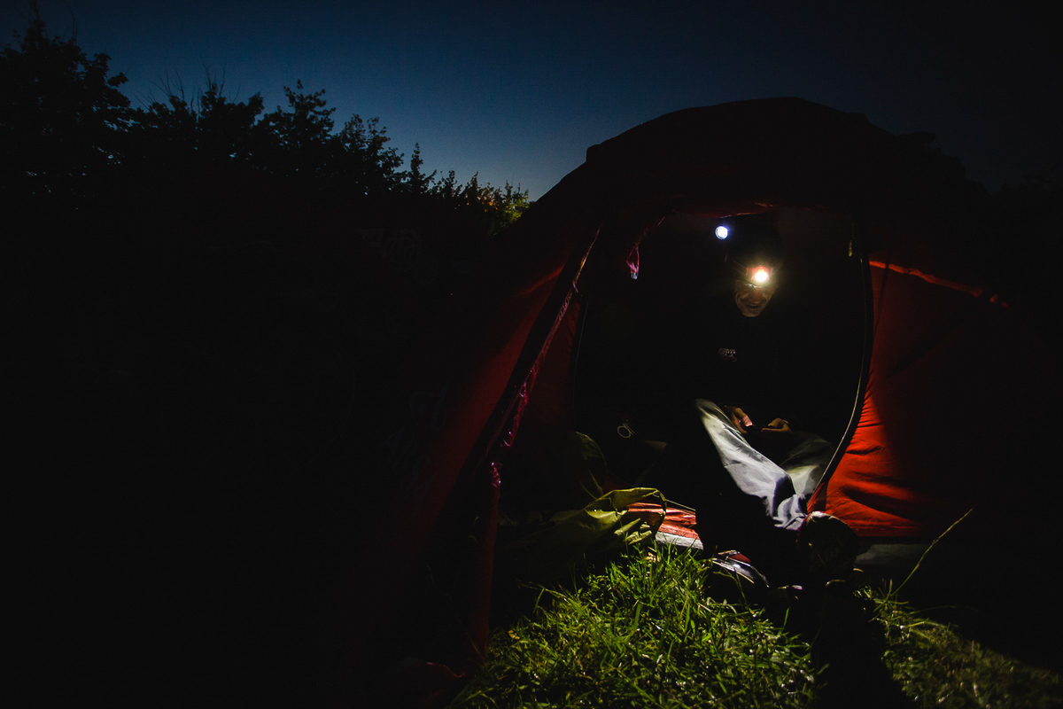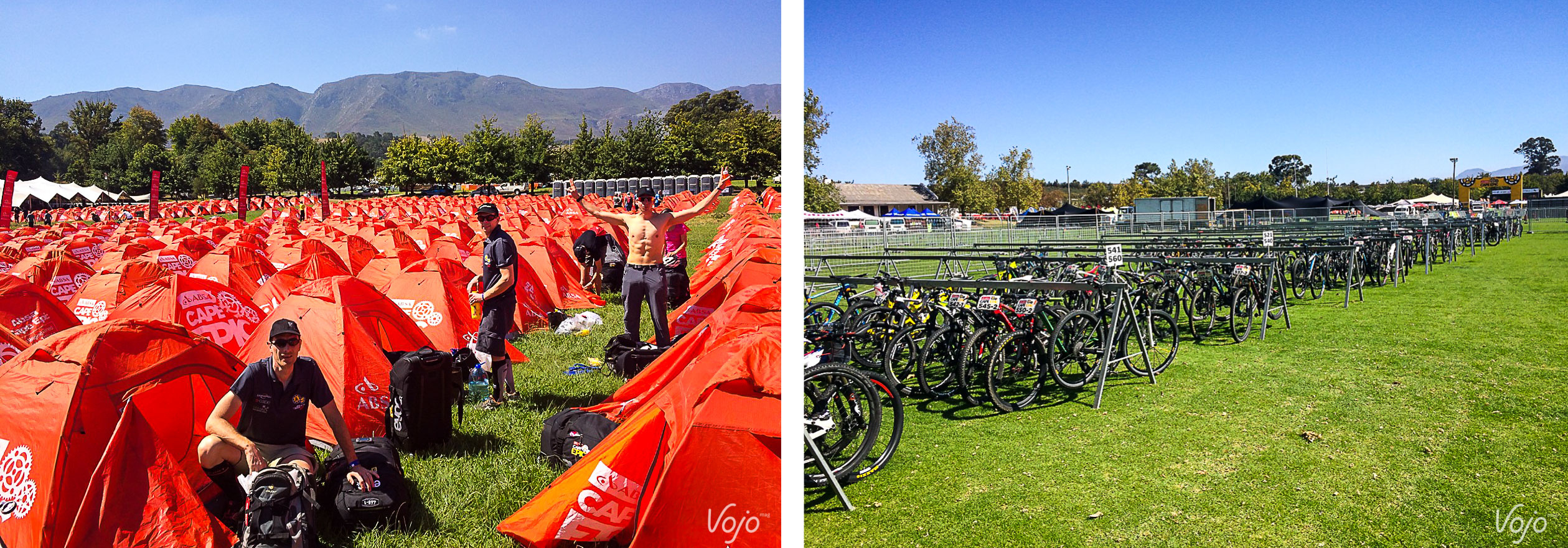 Après avoir choisi nos tentes (loin des WC comme on nous l’a conseillé), nous découvrons la vie au camp et c’est pour le moins impressionnant : douches et toilettes super bien conçues et très propre, zone de récupération avec bains d’eau froide, zones streching, coin bar pour les coureurs avec sofas,…