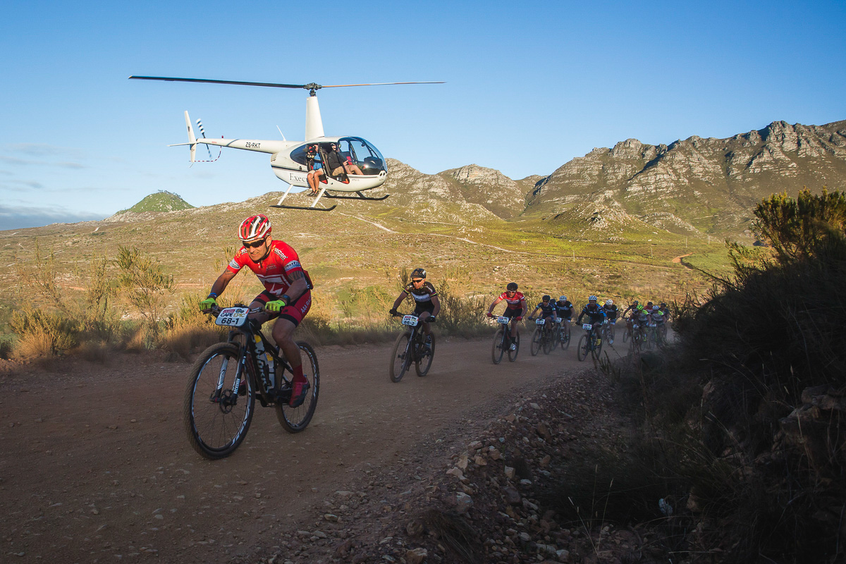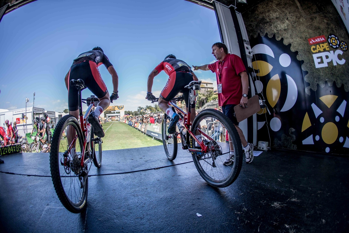 5, 4, 3, 2…1 ça y est, nous sommes partis ! L’aventure démarre… Sympa de prendre le départ et de se voir dans l’écran géant ! L’étape débute par un peu d’asphalte. On enchaîne les montées et les parties plus plates. Thomas donne le tempo et j’essaye de suivre. Sur les 2 montées raides, il fait parler la puissance et je dois même le calmer un peu. Après une bonne dizaine de km, Thomas tente un petit Wheeling au sommet d’une bonne sous les acclamations du speaker (« here is first belgian team ! ») et du public. Il faut ensuite relancer sur une partie de route en faux plat. On perd quelques secondes le temps que je redescende les pulsations après cette partie bien raide. (image : Karin Schermbrucker/Sportzpics/Cape Epic)