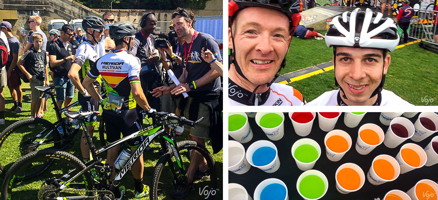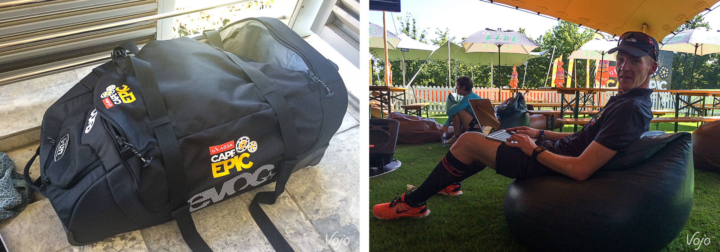 Le casse tête de la fin de journée consiste à tout caser dans le sac ! Le sac Evoc est super pratique et bien compartimenté mais plus petit que celui d’avant 2014. Pas facile de tout mettre. Heureusement, nous avons 2 plans « B ». Le premier est de laisser nos sacs vélos et du matériel à l’hôtel où nous revenons pour la nuit de dimanche, le second est de pouvoir bénéficier – grâce à Vojo Mag – d’accréditations médias nous permettant d’avoir 2 sacs supplémentaires pour notre matériel informatique et photo.