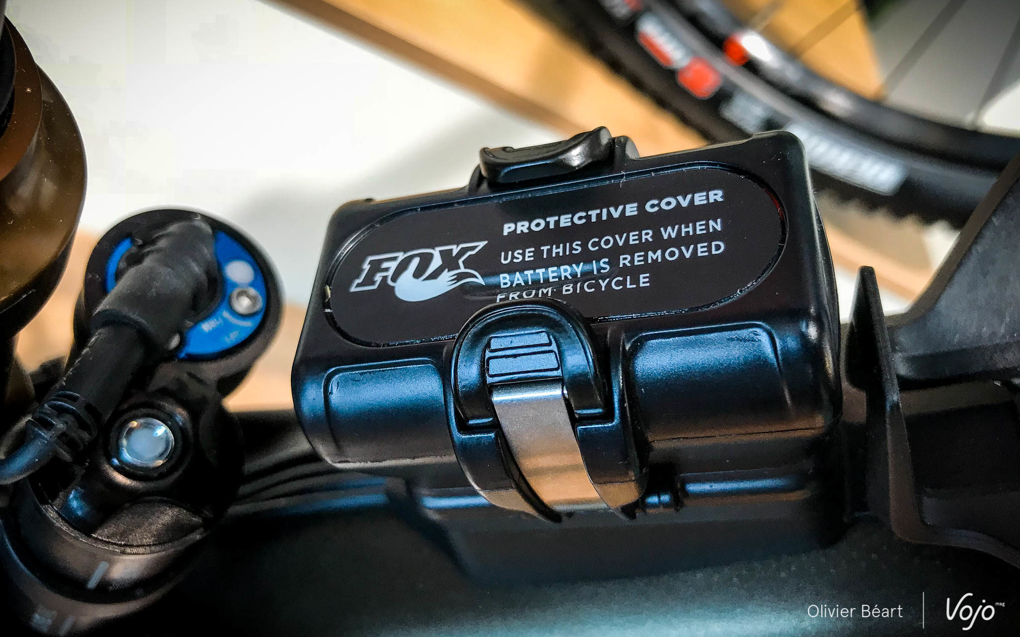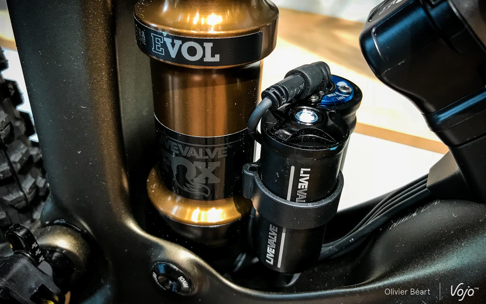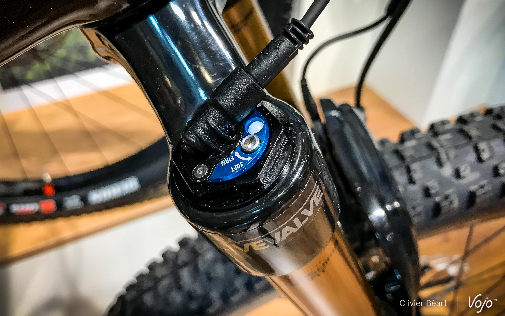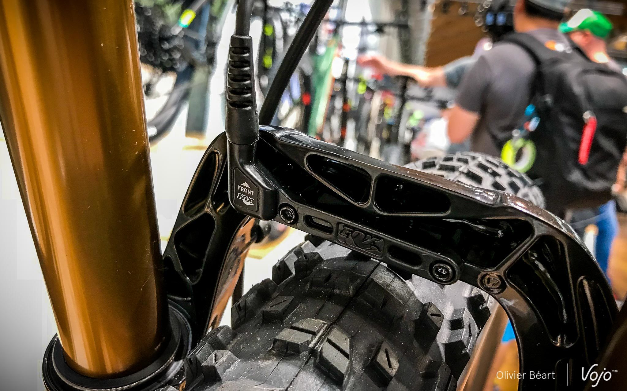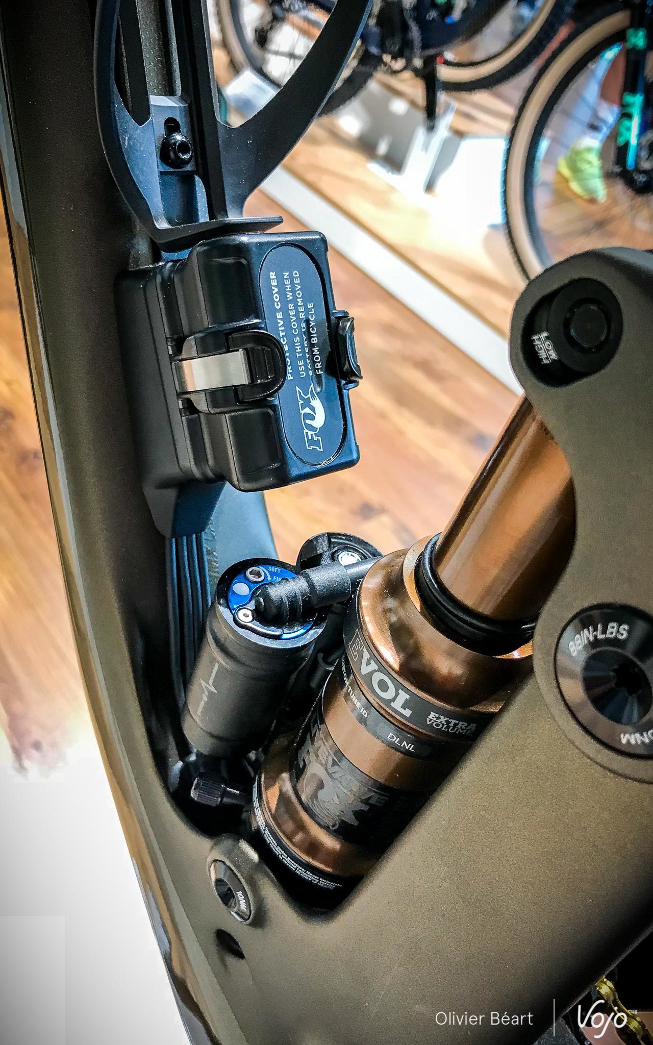 On ne sait encore que peu de choses sur le système Fox Live Valve, si ce n’est qu’il sera présenté officiellement en août. On peut voir qu’il se compose donc de deux capteurs situés près de chaque roue, et que ceux-ci sont reliés à un boîtier qui joue le rôle d’unité centrale. Ici, pour le salon, il était remplacé par une boîte vide, sans doute pour éviter les vols et pour garder une part de mystère.