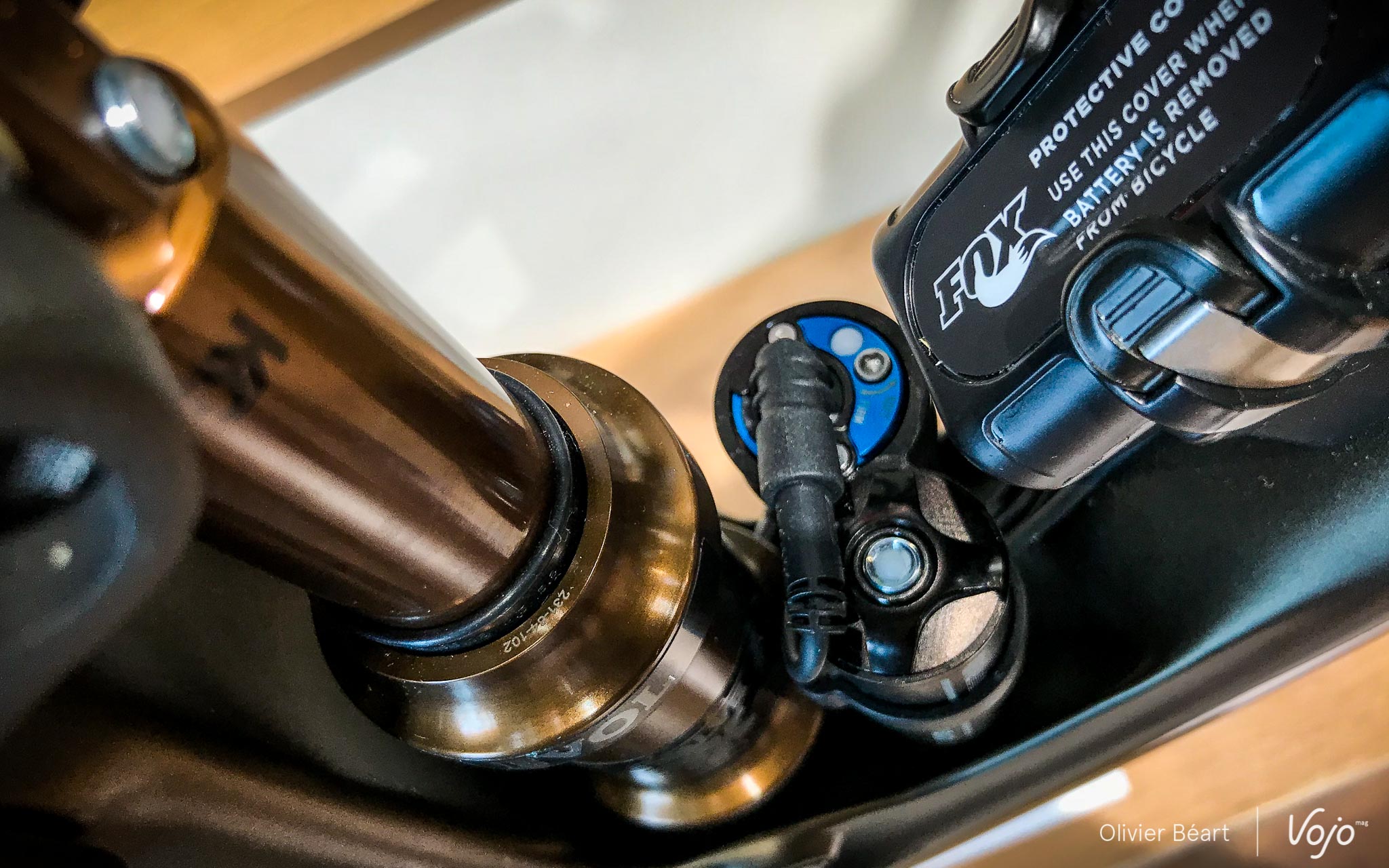 Puis, vous aurez aussi noté qu’il y a deux petits trous derrière l’arceau des fourches Fox depuis quelques saisons. Ce n’est pas pour mettre un garde-boue (même si on peut), mais aussi pour placer le capteur avant du système !