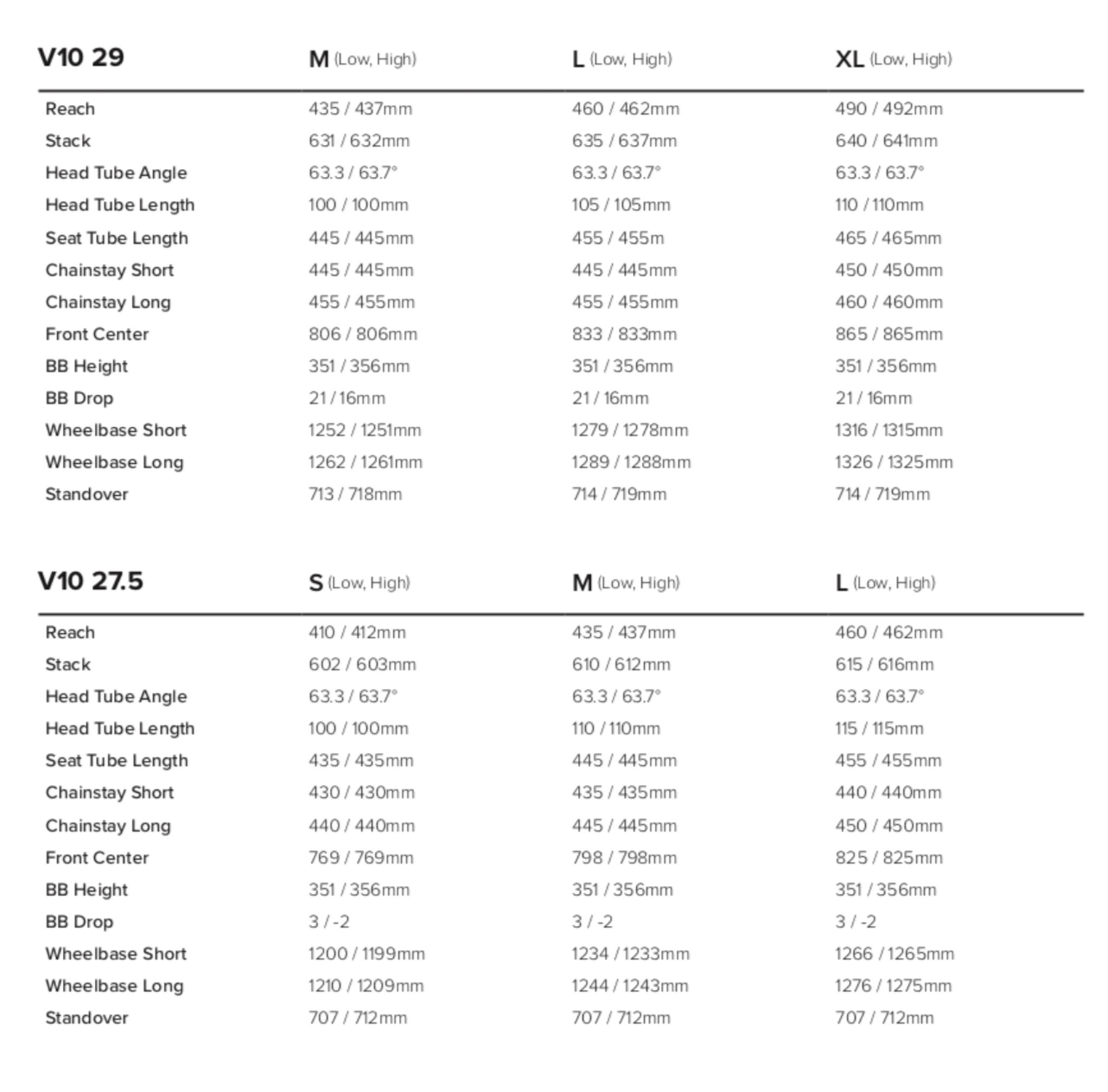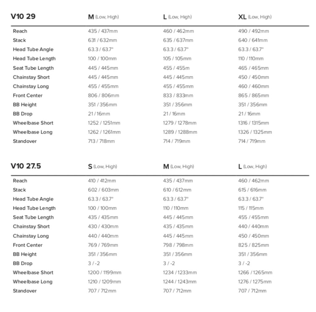 Le V10 carbone 2019 équipé de 27,5 pouces sera disponible en tailles S, M et L quand le 29 pouces sera disponible en M, L et XL. Le tout ne sera disponible qu’avec la finition carbone la plus haut de gamme et baptisée CC. Deux montages complets seront proposés (DH S, avec amortisseur Fox DHX2 Performance Elite Coil et DH X01 avec amortisseur Fox DHX2 Factory SLS Coil) et un cadre seul sera à la gamme avec un amortisseur Fox DHX2 Factory SLS Coil.