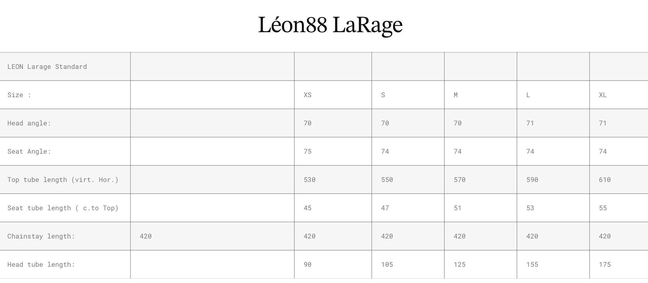 Côté géométrie, le Léon LaRage de série se caractérise par un angle de direction de 70°, un angle de tube de selle de 74°, des bases de 420 mm et une douille de direction de 125 mm en taille M.