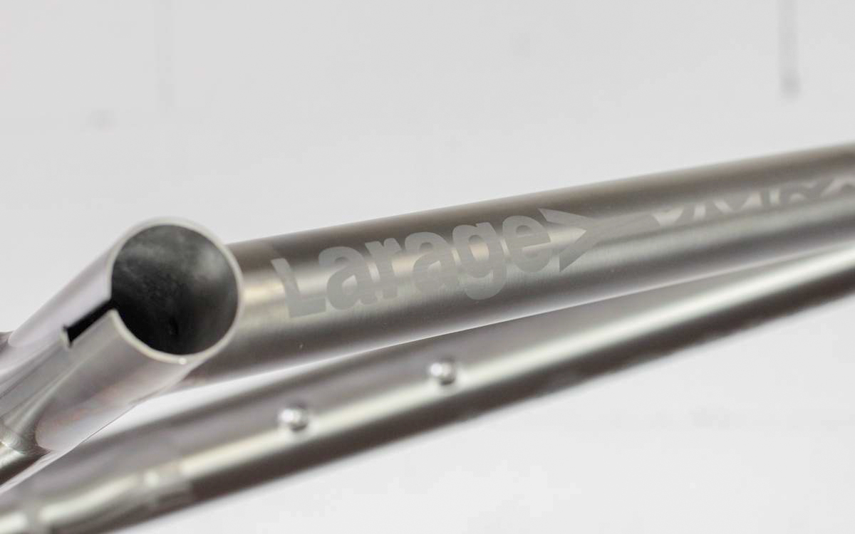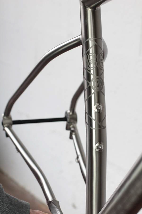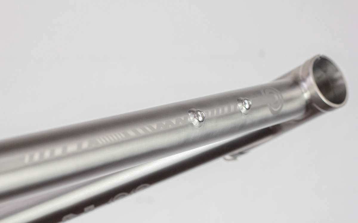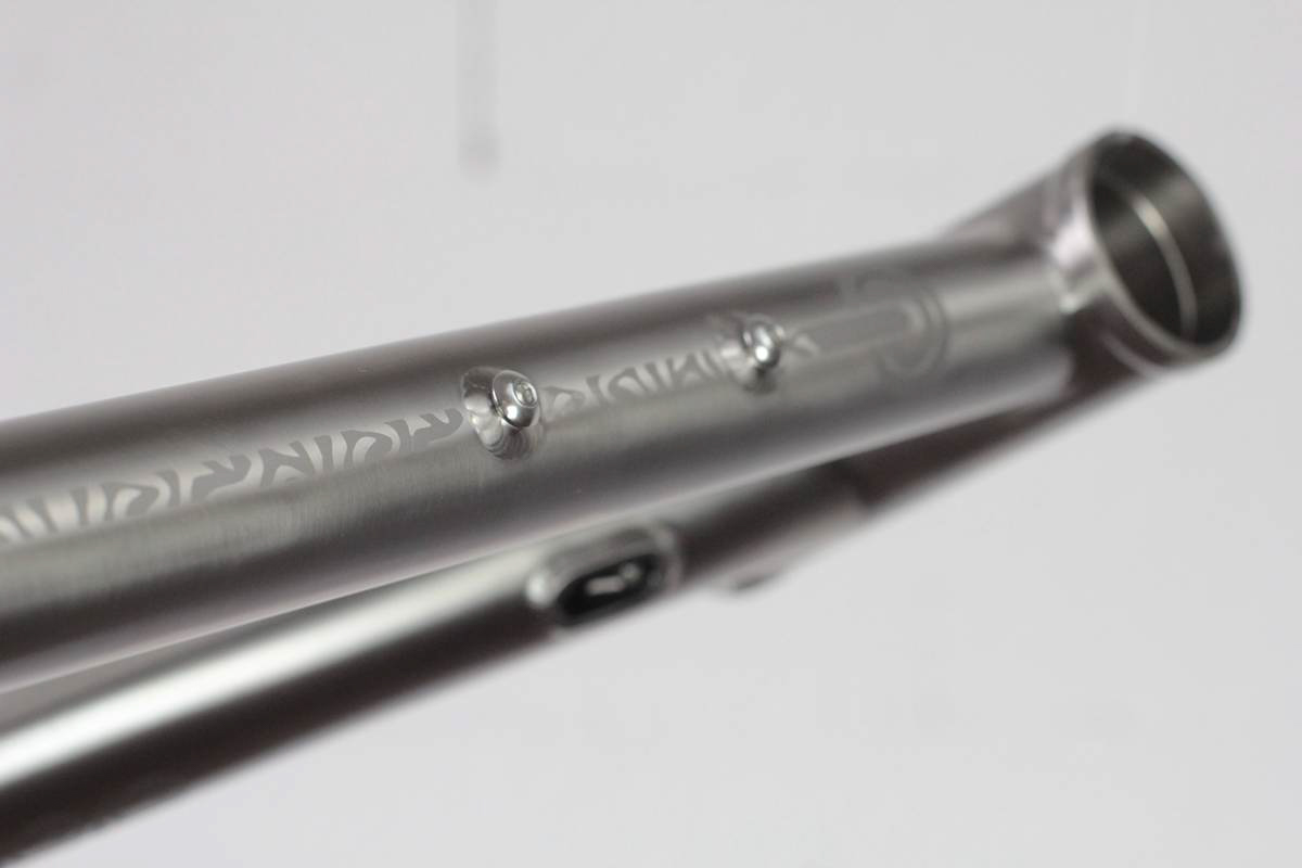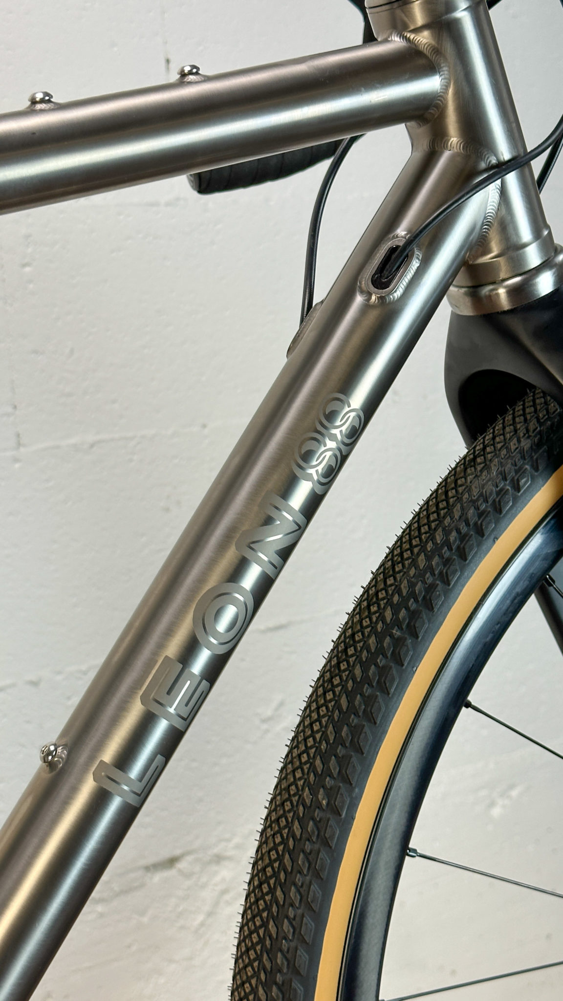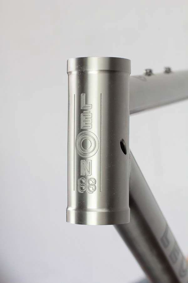 Il n’y a pas de doute, c’est bien un Léon88 que l’on a face à nous ! Au-delà du titane qui peut nous mettre la puce à l’oreille, ce sont les différents détails du cadre qui viennent donner cette identité propre au cadre : la gravure sur la douille de direction, les finitions microbillées, mais aussi ce décalage de l’ancrage du haut des haubans par rapport au top tube qui est caractéristique de la gamme.