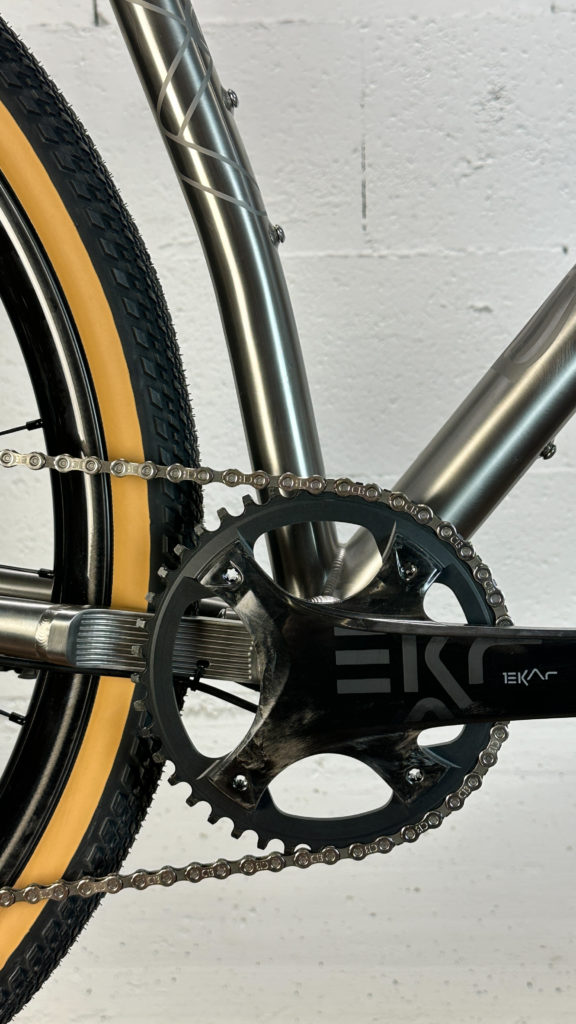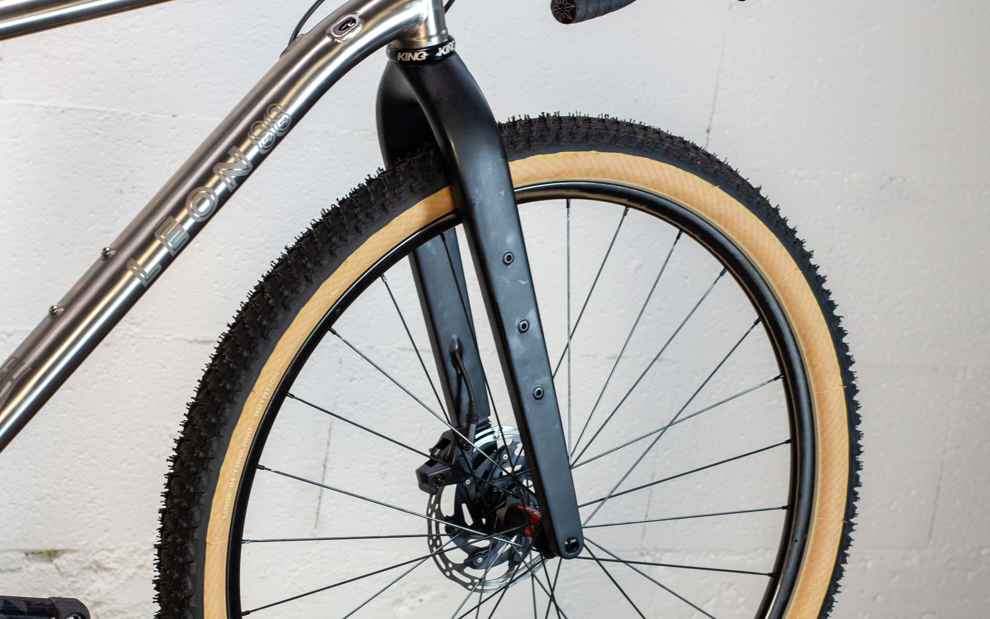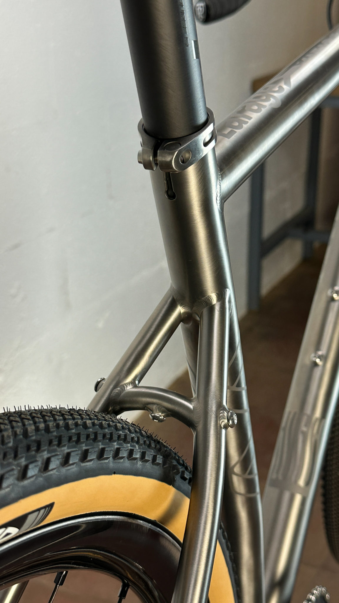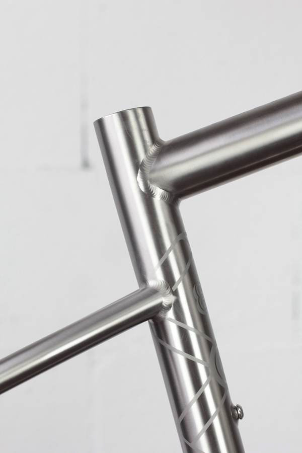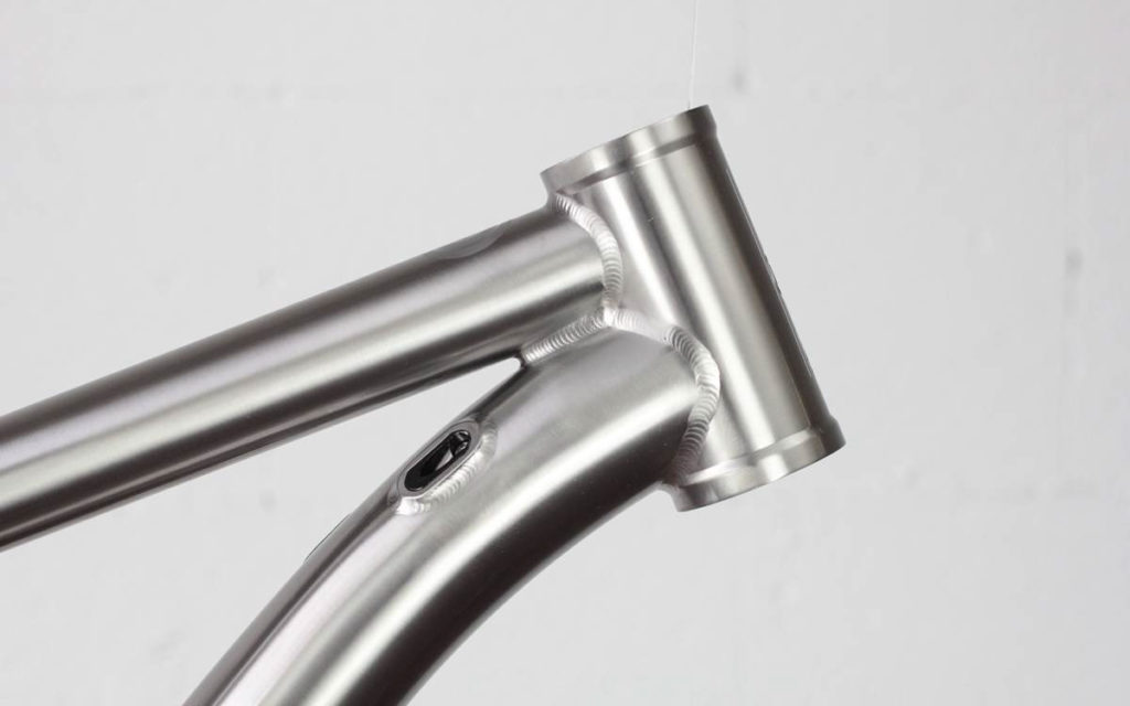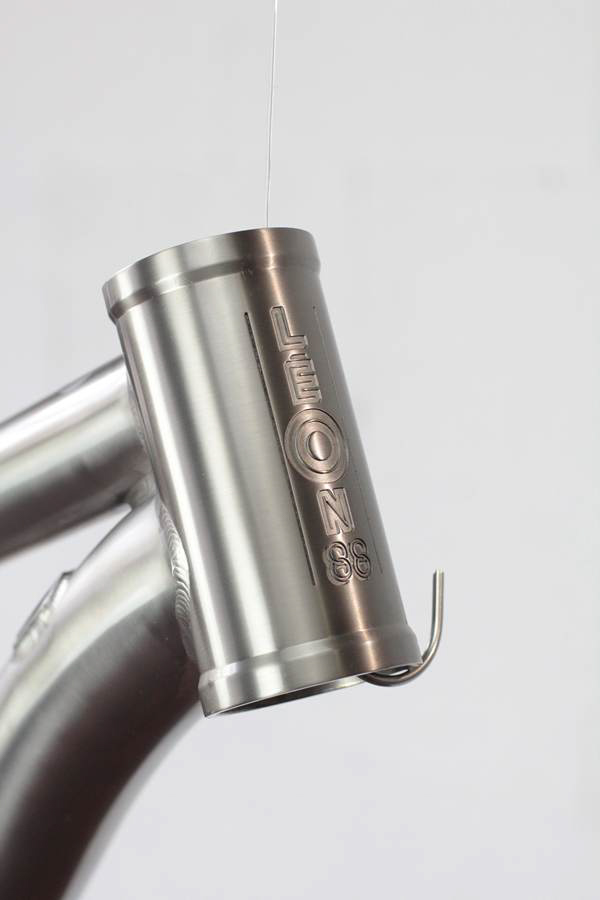 Il n’y a pas de doute, c’est bien un Léon88 que l’on a face à nous ! Au-delà du titane qui peut nous mettre la puce à l’oreille, ce sont les différents détails du cadre qui viennent donner cette identité propre au cadre : la gravure sur la douille de direction, les finitions microbillées, mais aussi ce décalage de l’ancrage du haut des haubans par rapport au top tube qui est caractéristique de la gamme.
