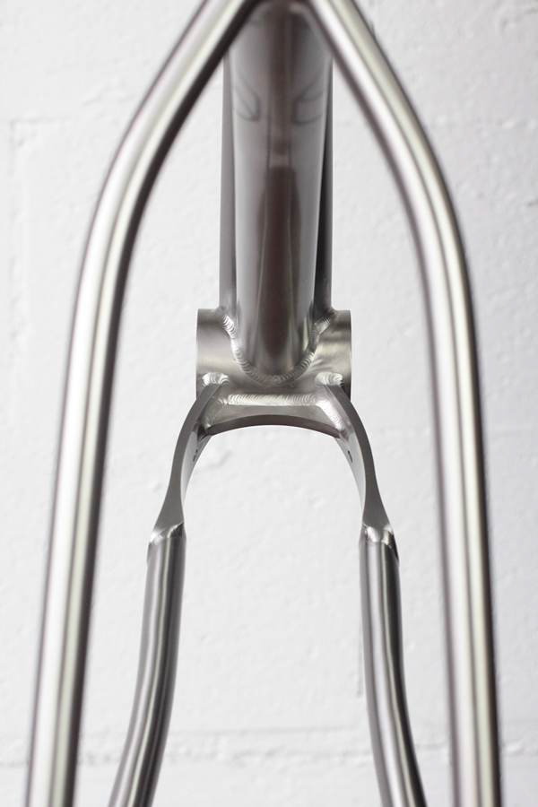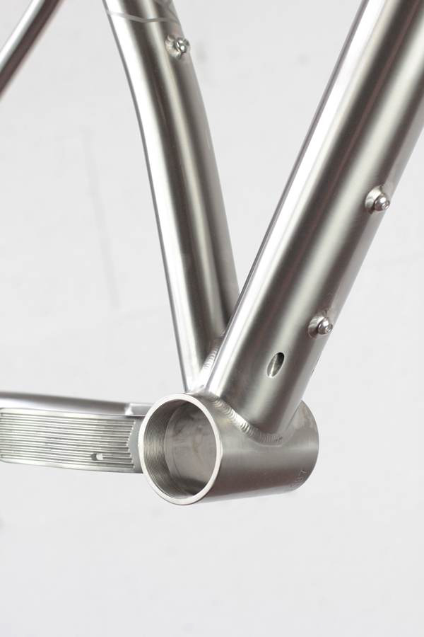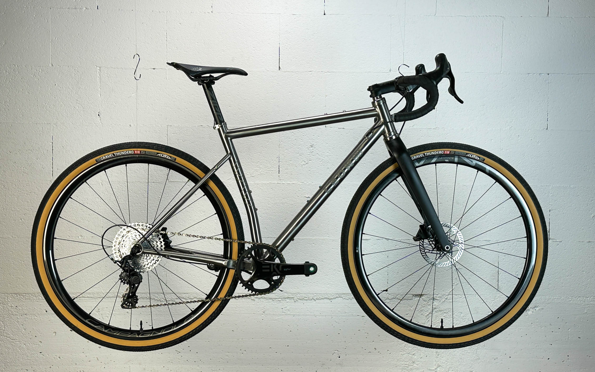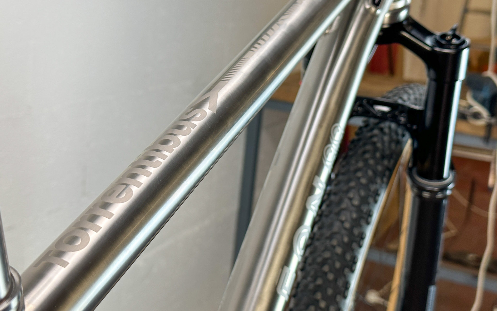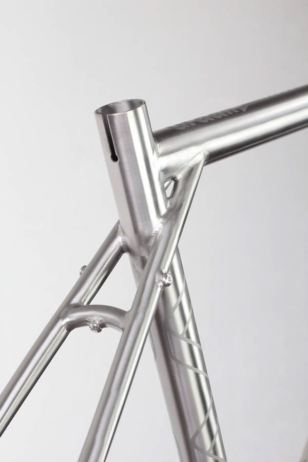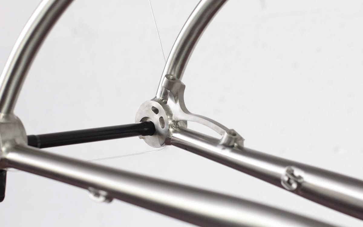 Il n’y a pas de doute, c’est bien un Léon88 que l’on a face à nous ! Au-delà du titane qui peut nous mettre la puce à l’oreille, ce sont les différents détails du cadre qui viennent donner cette identité propre au cadre : la gravure sur la douille de direction, les finitions microbillées, mais aussi ce décalage de l’ancrage du haut des haubans par rapport au top tube qui est caractéristique de la gamme.