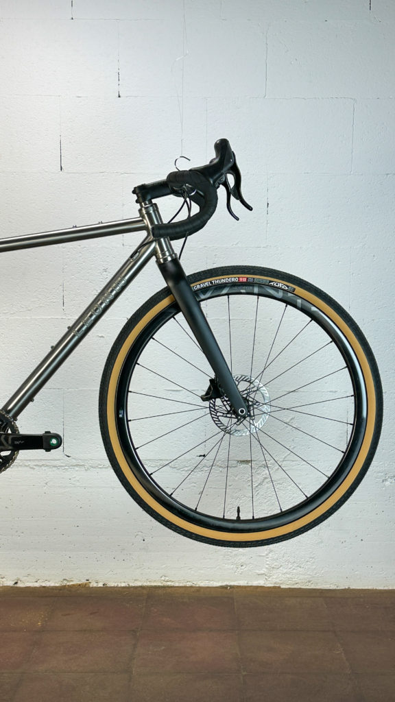 Pour le GraALL, c’est au niveau du tube de direction que se fait l’entrée du passage interne des câbles et Durits. Comme il est de coutume, de nombreuses fixations sont prévues afin d’accueillir des porte-bidons, accessoires de bikepacking et encore bagageries diverses. Léon précise que le cadre est prévu pour accueillir des pneus jusqu’en 700 x 42.