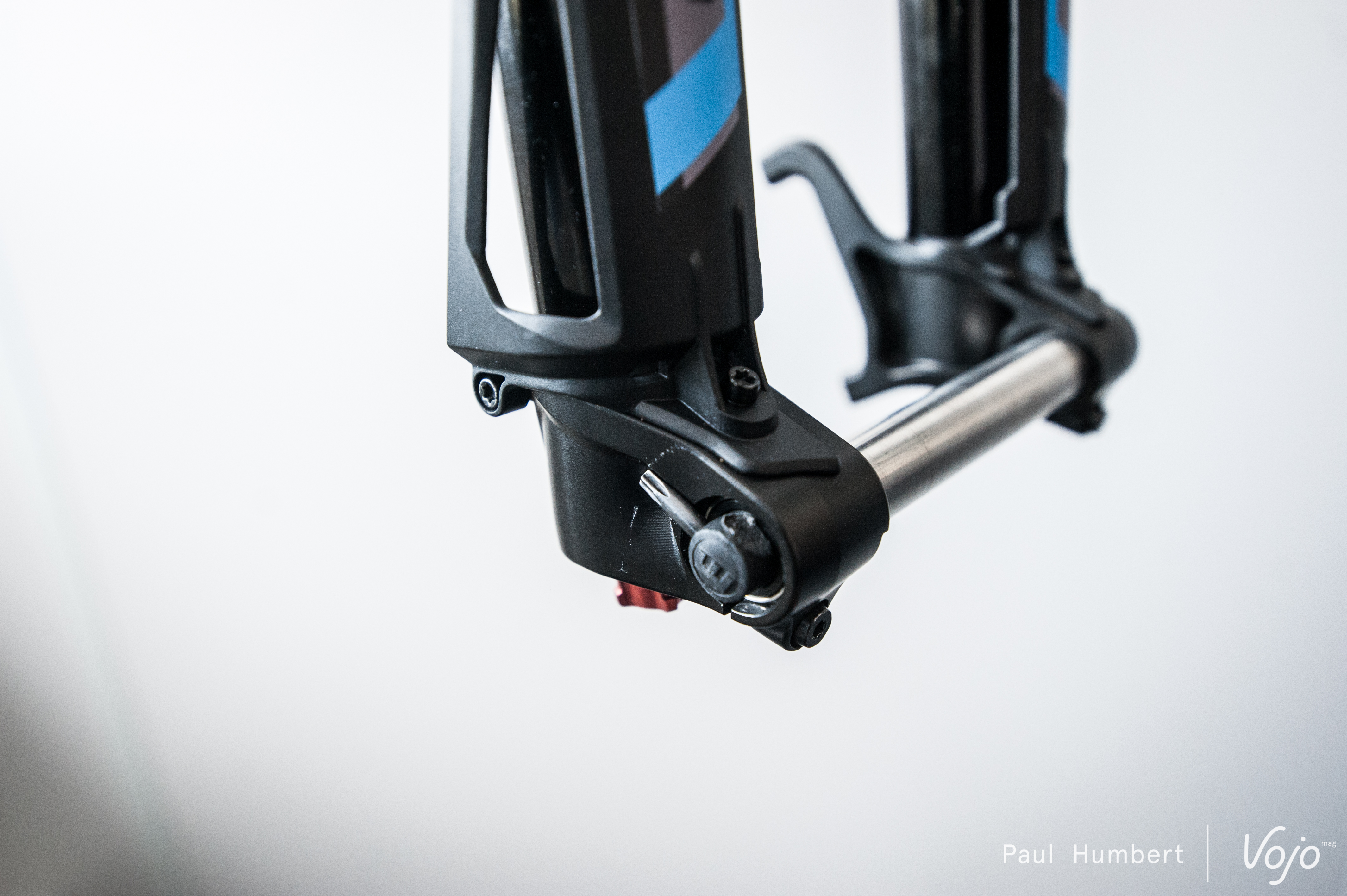 C’est pour répondre aux problématiques de rigidité que Magura a opté pour une fourche inversée et des plongeurs de 35mm. Les plus grosses tensions s’effectuent juste sous le té et c’est pourquoi la marque a vu grand. Pour toujours plus de rigidité, un axe de 20mm en acier équipe la fourche.