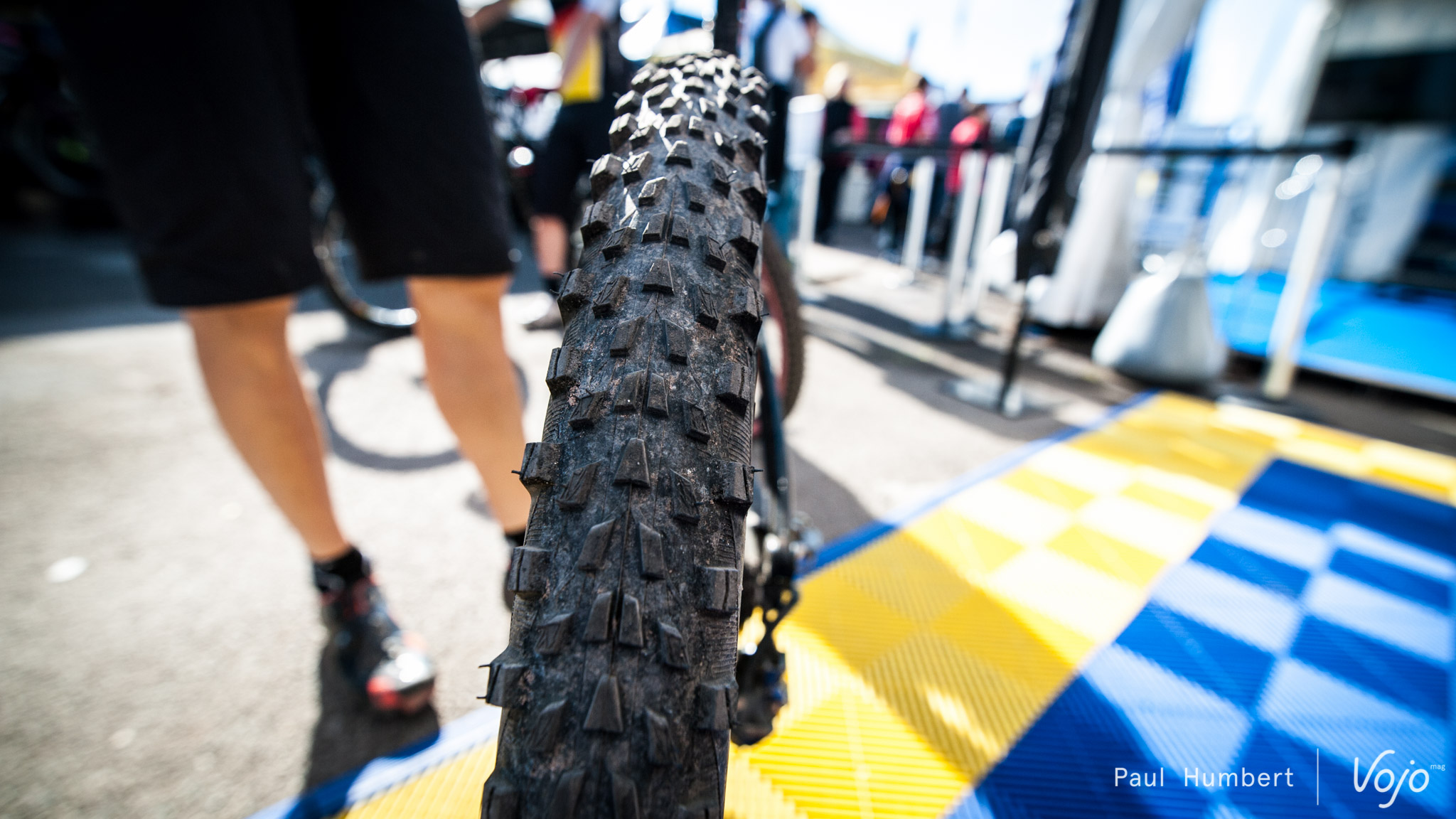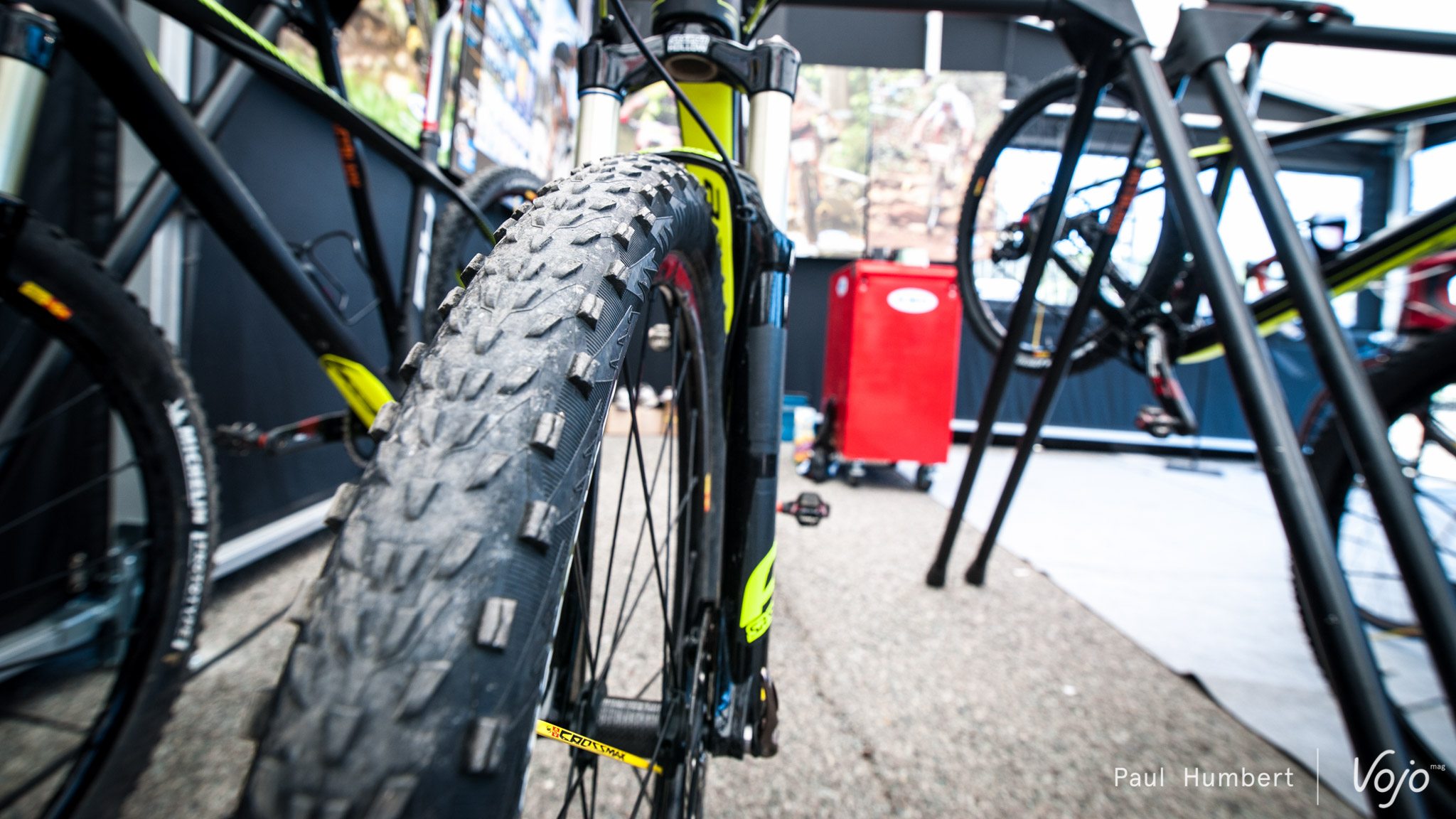 Nous l’avions déjà aperçu lorsque nous avons examiné les vélos des pros, dont le BH de Maxime Marotte, un peu plus tôt cette saison. Mais cette fois, Pierre Lebreton, le team manager, accepte de nous en dit plus alors qu’il était resté complètement muet jusqu’alors : « C’est un prototype Michelin pour les roues de 29 pouces. Il offre une très faible résistance au roulement tout en accrochant vraiment bien. Le pneu est très sain et il ne décroche pas d’un coup sec comme certaines autres références. C’est très important pour les pilotes qui roulent en semi-rigide. »