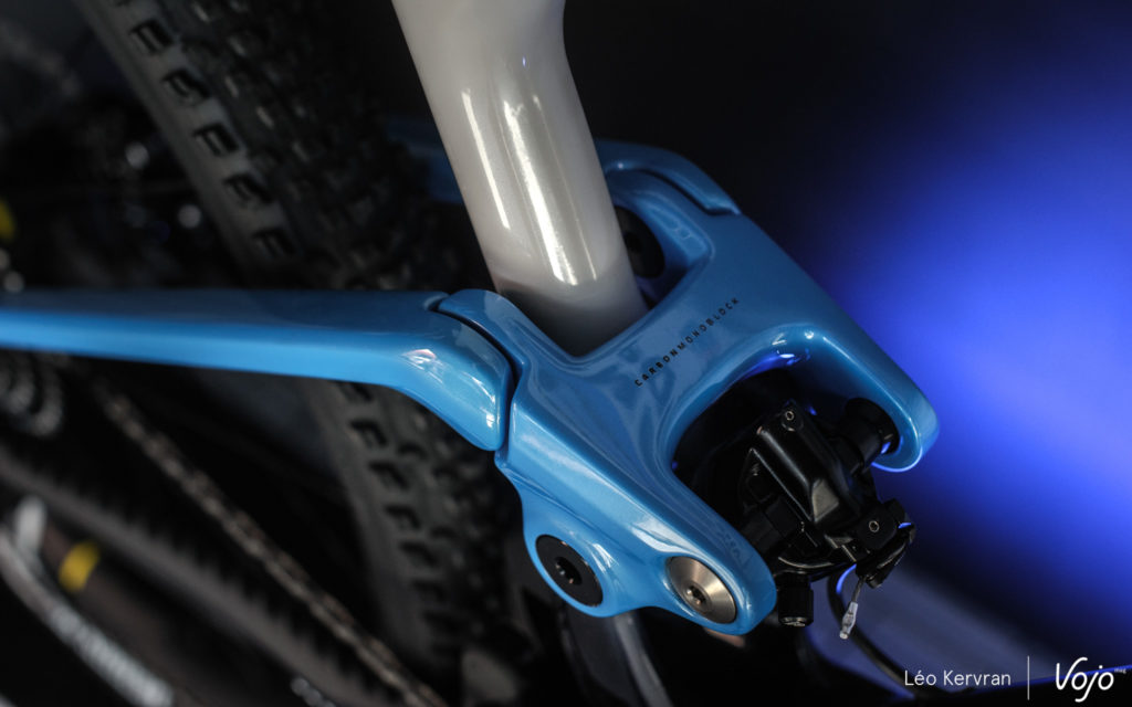 On remarque que le triangle arrière a été revu en profondeur. L’angle au-dessus de l’axe de roue disparaît et le bras de renfort devant le pneu est asymétrique et plus discret ce qui donne à l’ensemble une apparence plus aérée, plus légère. Pour un gain de poids réel ou juste une impression ?