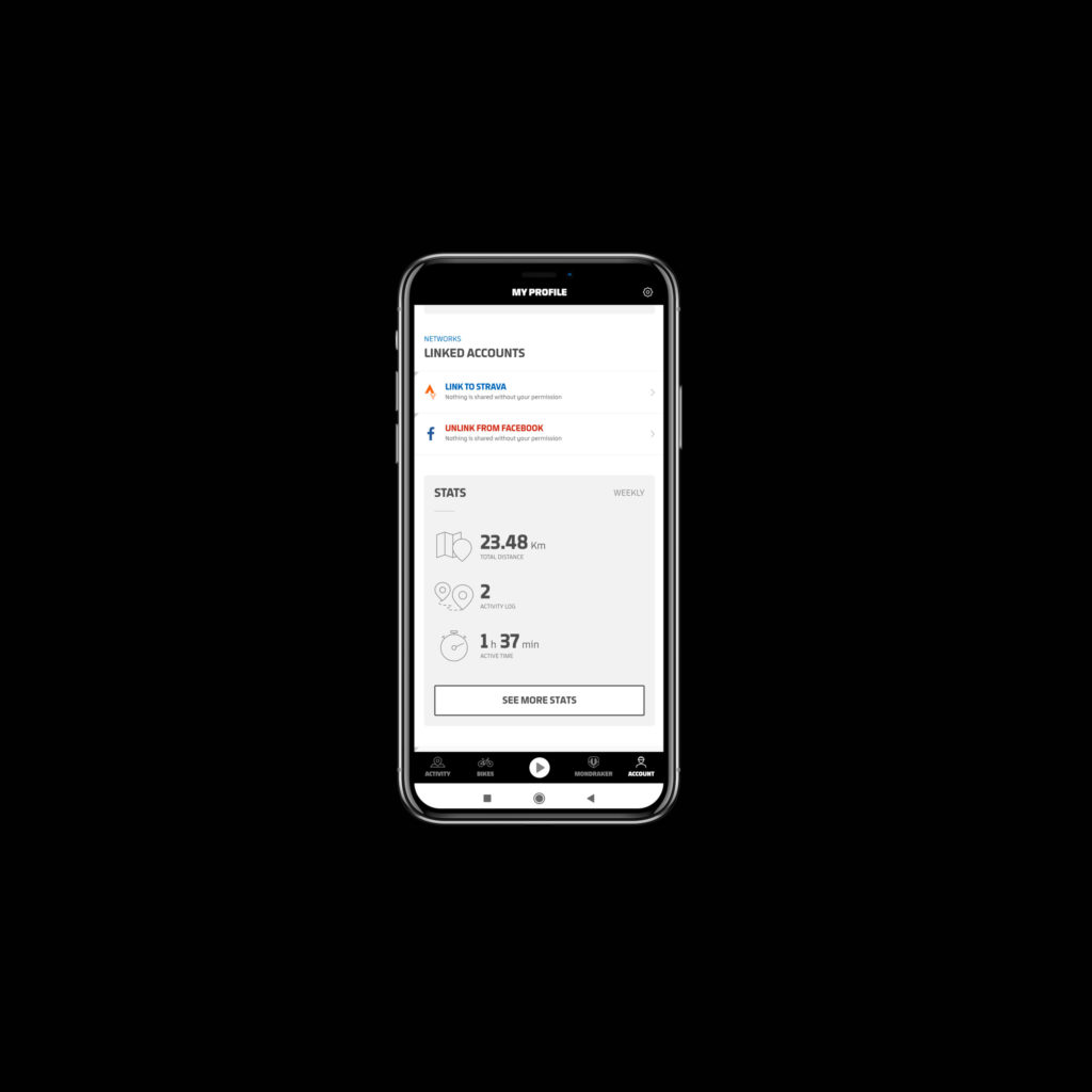Dotée d’une puce Bluetooth, l’unité centrale transfère les informations de la sortie vers le téléphone du propriétaire, où l’application myMondraker (compatible avec Strava) permet de consulter et d’analyser sa sortie. C’est également l’application qui fait office de télécommande pour démarrer et arrêter le système, on ne peut pas le faire directement depuis le vélo. Notons aussi qu’un site internet myMondraker.com a été lancé, qui donne accès à des données encore plus complètes et précises que l’application.