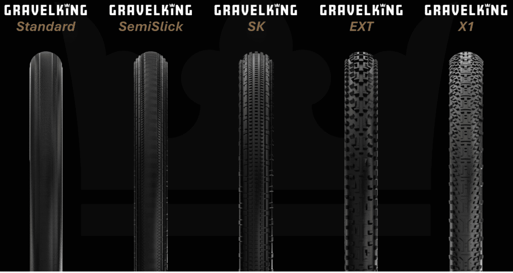 Dorénavant, Panaracer comptabilise cinq modèles de Gravelking. Si nous les classons du profil le plus lisse au plus cramponné, cela donne en premier le Gravelking Slick (dessin lisse, sans crampon), le Gravelking SemiSlick, suivi du Gravelking SK, le tout nouveau Gravelking X1 et pour finir le Gravelking EXT (avec les plus haut crampons de la gamme).