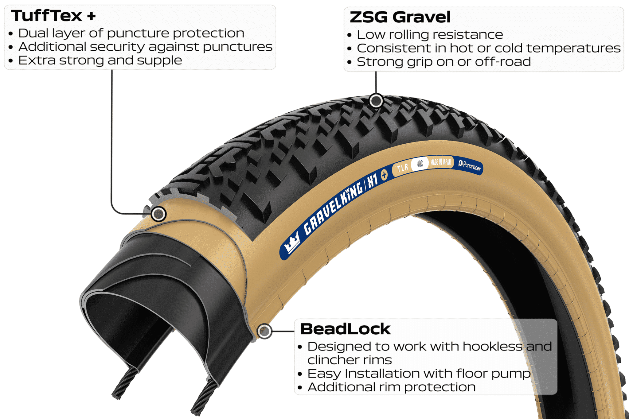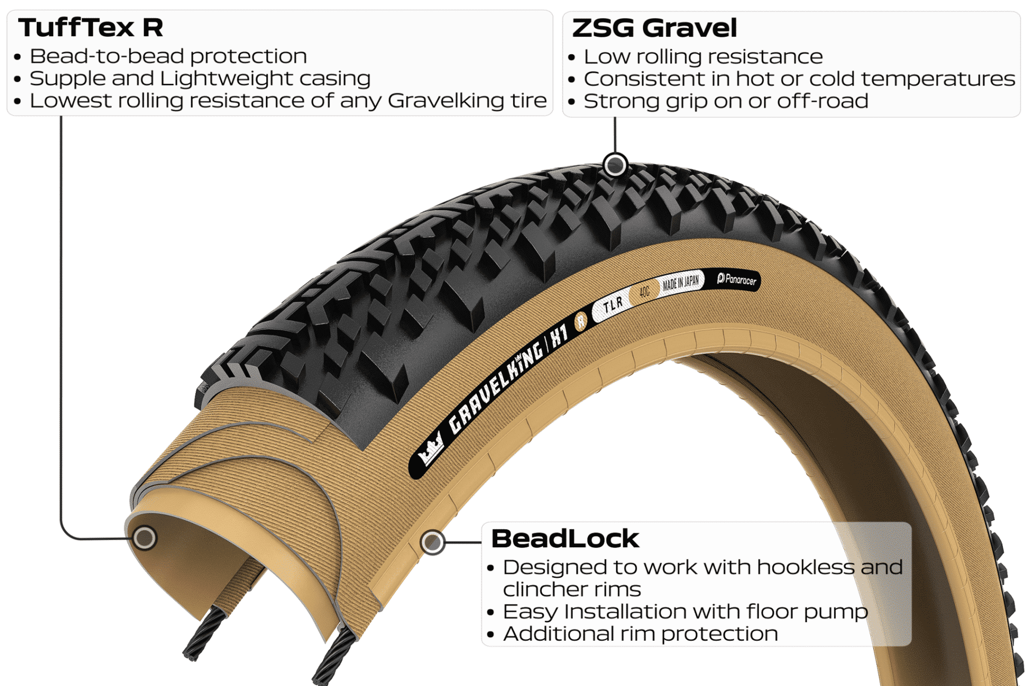 Pour accompagner le nouveau dessin polyvalent Gravelking X1, Panaracer dévoile la nouvelle carcasse performance TuffTex R sur ses pneus les plus haut de gamme dans leur finition « R ». Pour rappel, trois carcasses en 120 TPI sont disponibles sur les modèles Gravelking, TuffTex Standard (la plus accessible), la Tufftex Plus (renforcée pour être plus résistante aux crevaisons) et la nouvelle R (orientée performance, il s’agit de la plus légère offrant donc moins de résistance au roulement). Toutes sont associées à la nouvelle gomme ZSG (Zero Slip Grip).