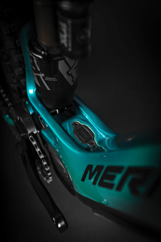 Le triangle avant est donc tout neuf, avec maintenant une nouvelle batterie Shimano complètement intégrée et plus compacte que par le passé. Juste derrière la douille de direction, on remarque des aérations : c’est ce que Merida appelle les Thermogate. Ces « cheminées » sont là pour faciliter l’évacuation de la chaleur au niveau de la batterie, notamment si le vélo reste au soleil longtemps (lors d’une pause par exemple). Pour conserver une rigidité suffisante malgré ces trous importants dans le tube diagonal, Merida a fait le choix d’utiliser une douille de direction en 1,5″ (mais le jeu de direction est prévu pour de fourche classique au pivot conique).