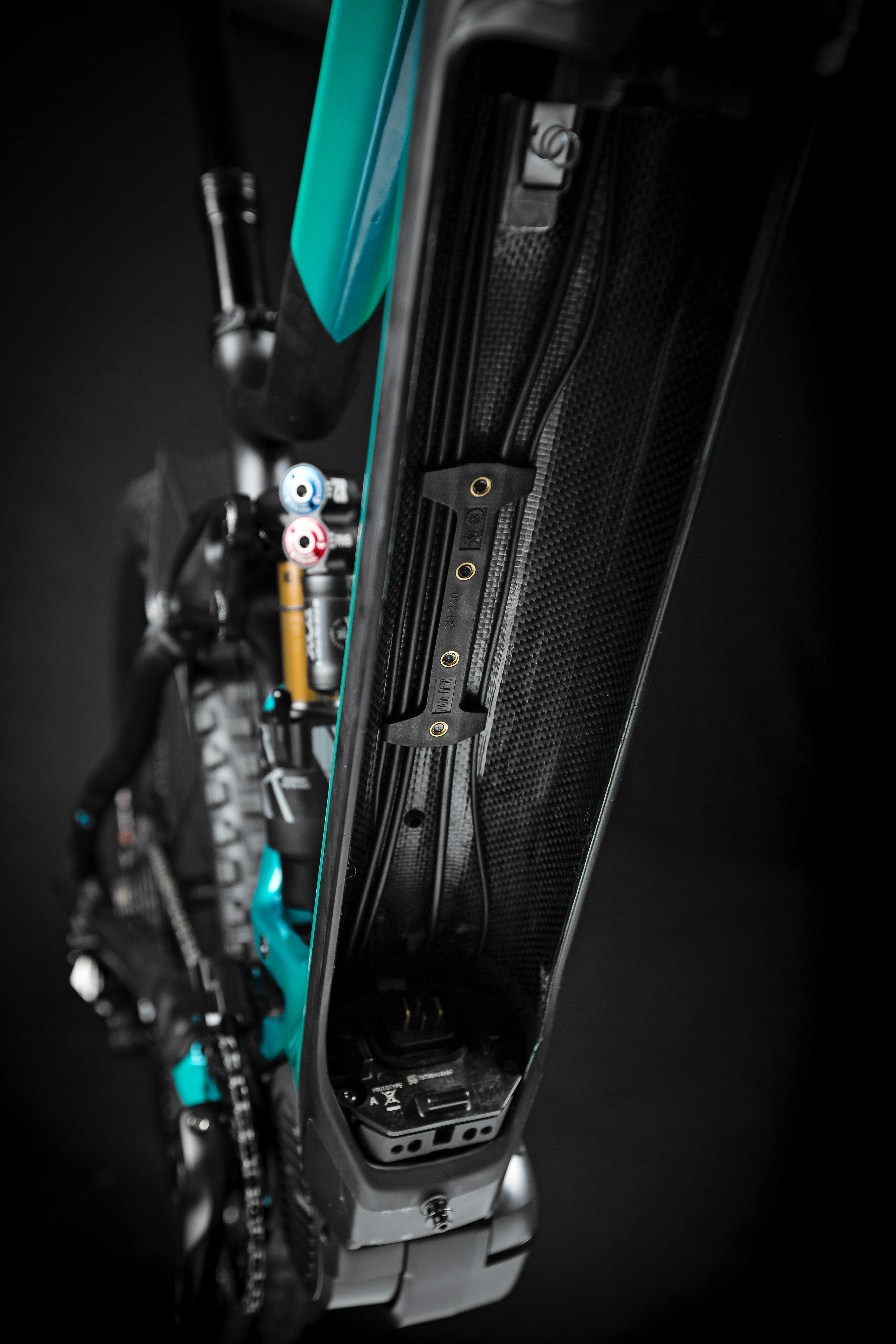 Ces entrées facilitent également le passage des câbles et gaines dans le triangle avant. Ces dernières passent ensuite entre la batterie et le cadre et sont intelligemment maintenues par le support de porte-bidon. Il faut donc démonter la batterie pour y accéder. Le triangle arrière, en aluminium, est identique à la version précédente. Côté poids, cette nouvelle version pèse 21,93 kg dans le montage le plus haut de gamme.