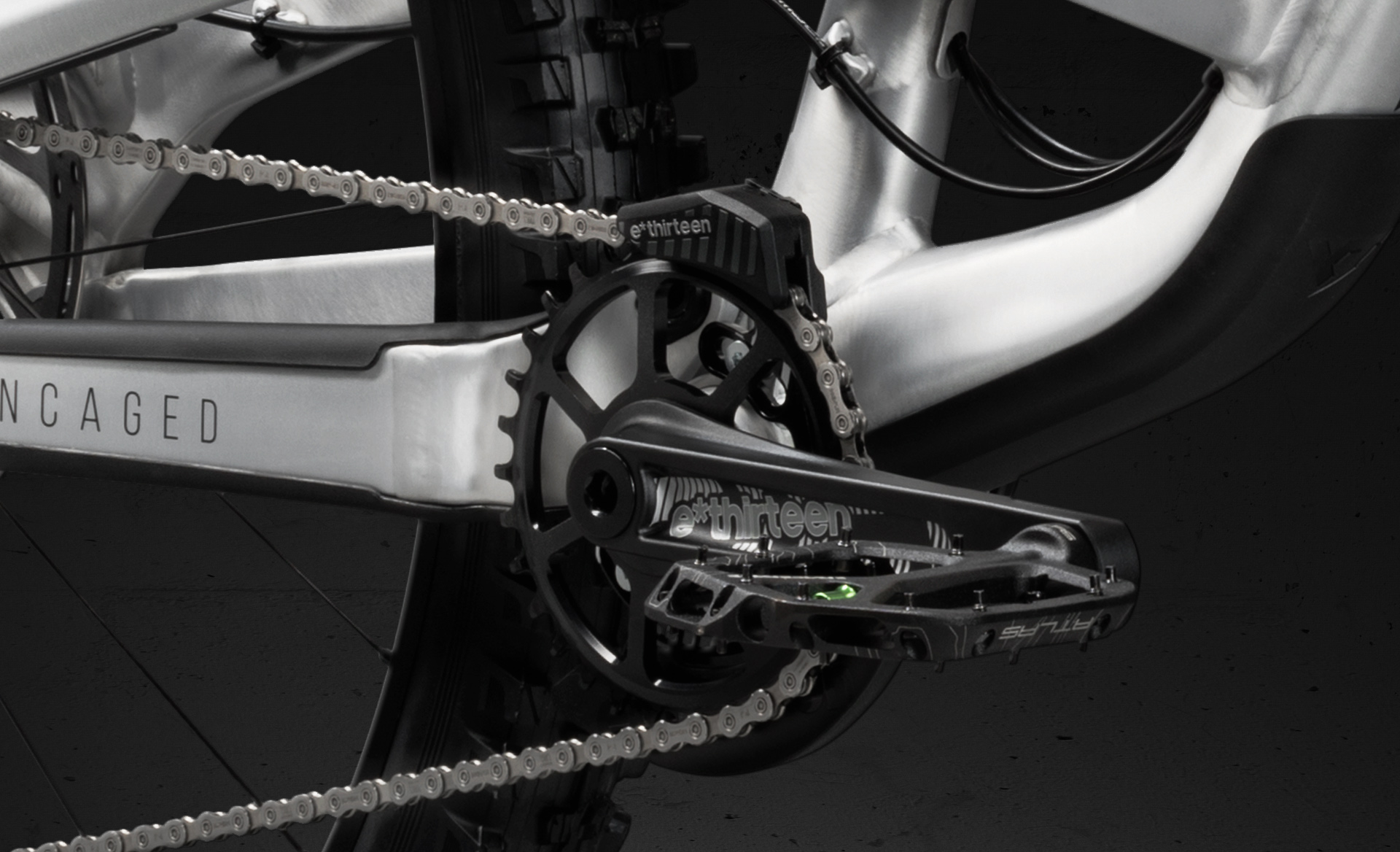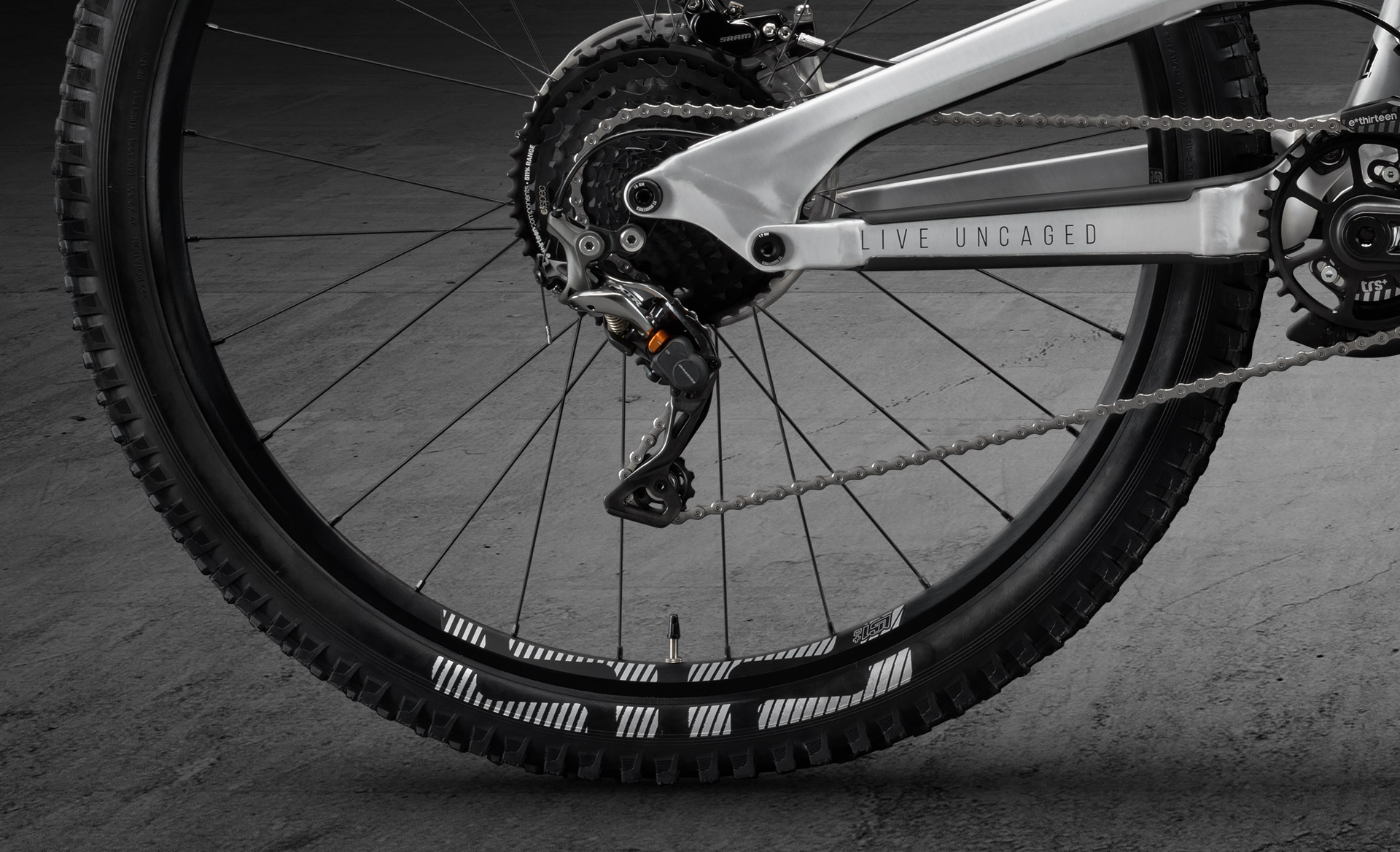 Le reste de l’équipement est du même acabit avec un dérailleur Shimano XTR 11v et un ensemble cassette-pédalier-train roulant fourni par E-Thirteen.