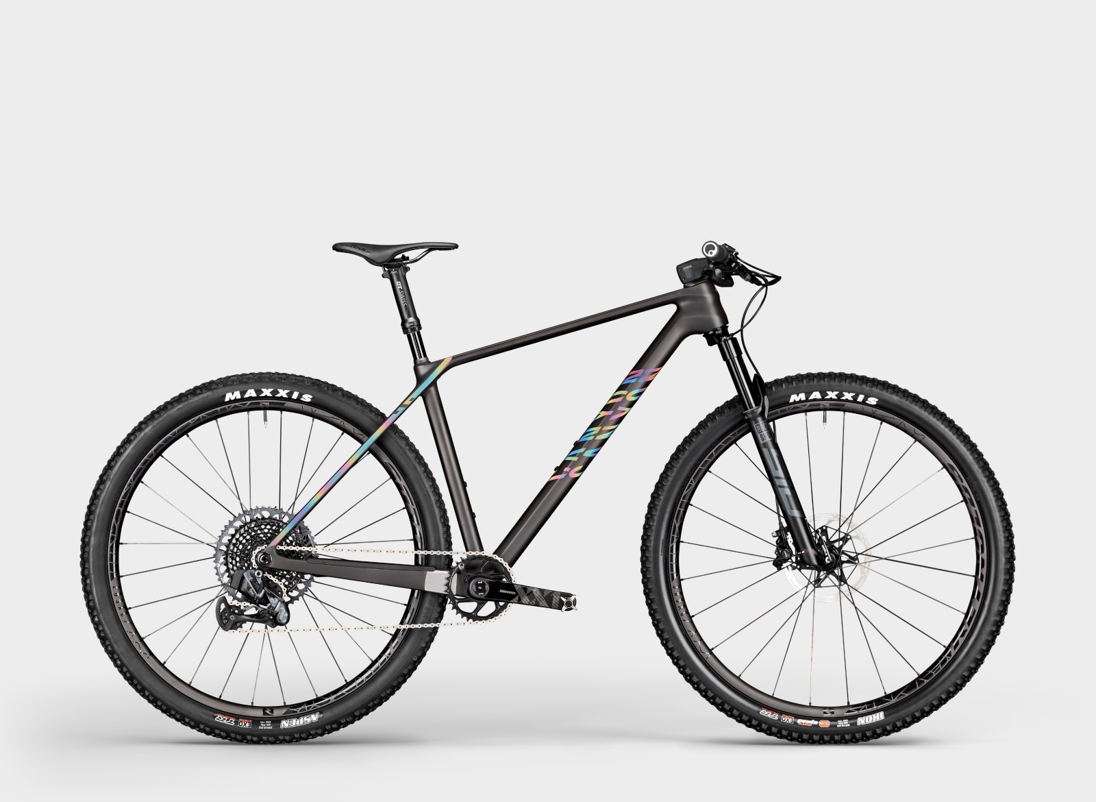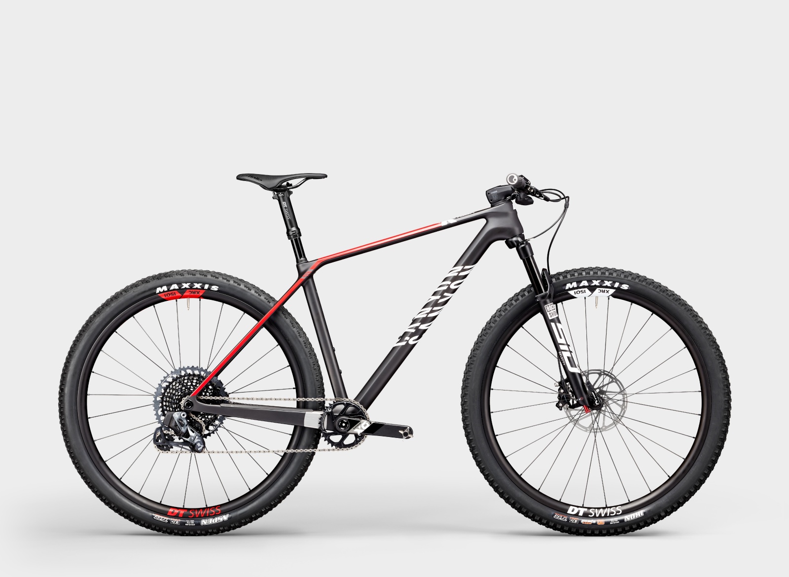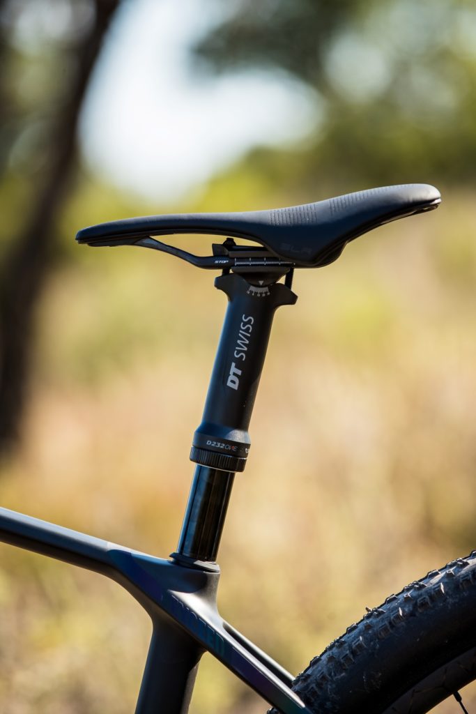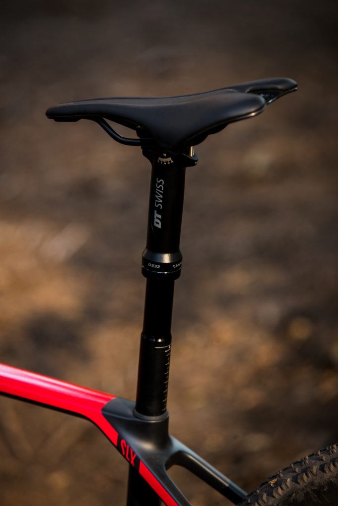 Pour la tige de selle, c’est une DT Swiss D232 One tout ce qu’il y a de plus classique, en aluminium sur les modèles SLX comme à gauche ci-dessus ou en carbone (à droite) sur les modèles CFR et diamètre 30,9 mm. Très légère (390 ou 420 g avec commande selon le matériau), elle dispose d’une course de 60 mm qui peut paraître faible mais qui suffit souvent à faire la différence en XCO. D’après la marque, c’est son mécanisme inversé qui permet d’atteindre un tel poids, en plus d’apporter une bonne fiabilité.