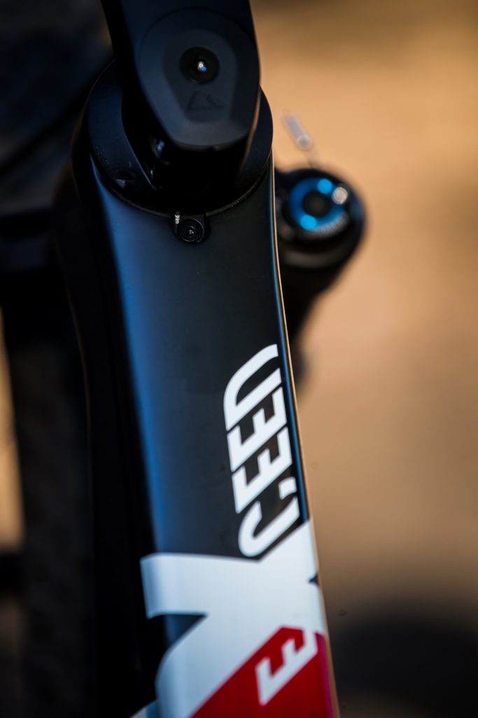 Enfin, du côté des détails on notera un blocage du jeu de direction IPU (pour Impact Protection Unit) plus petit, allégé et désormais entièrement intégré dans le cadre, un blocage de tige de selle lui aussi intégré, sans collier et des passages de gaines/Durit qui se font via le jeu de direction (spécialement dessiné dans ce but), ce qui évite de percer la douille de direction et allège visuellement le vélo. Le fameux blocage de roue arrière Quixle, avec le levier qui se range dans l’axe, est également de la partie, le support d’étrier arrière est au standard Flatmount et il y a suffisamment de dégagement pour accueillir des pneus en 2.35-2.4 montés sur des jantes en 30 mm de largeur interne.