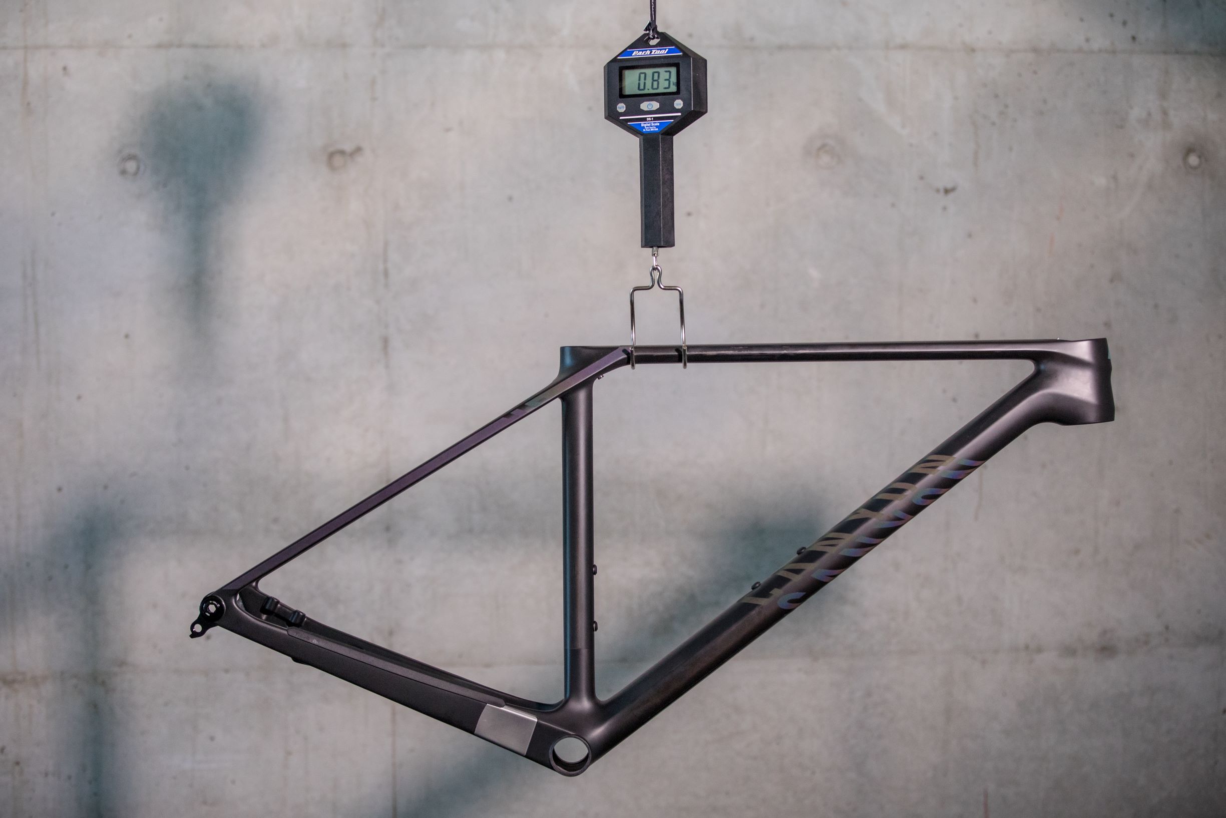 Le carbone n’est d’ailleurs pas le seul point sur lequel la marque allemande a cherché à gagner du poids puisqu’en version CFR, la finition (vernis, peinture, décorations) ne pèse que 39 g et le protège-base n’atteint même pas 10 g (annoncé à 9 g). Au total, en ajoutant également le serrage de selle, la protection contre les remontées de chaîne et la patte de dérailleur universelle Sram, le cadre ne dépasse pas les 835 g sur la balance.