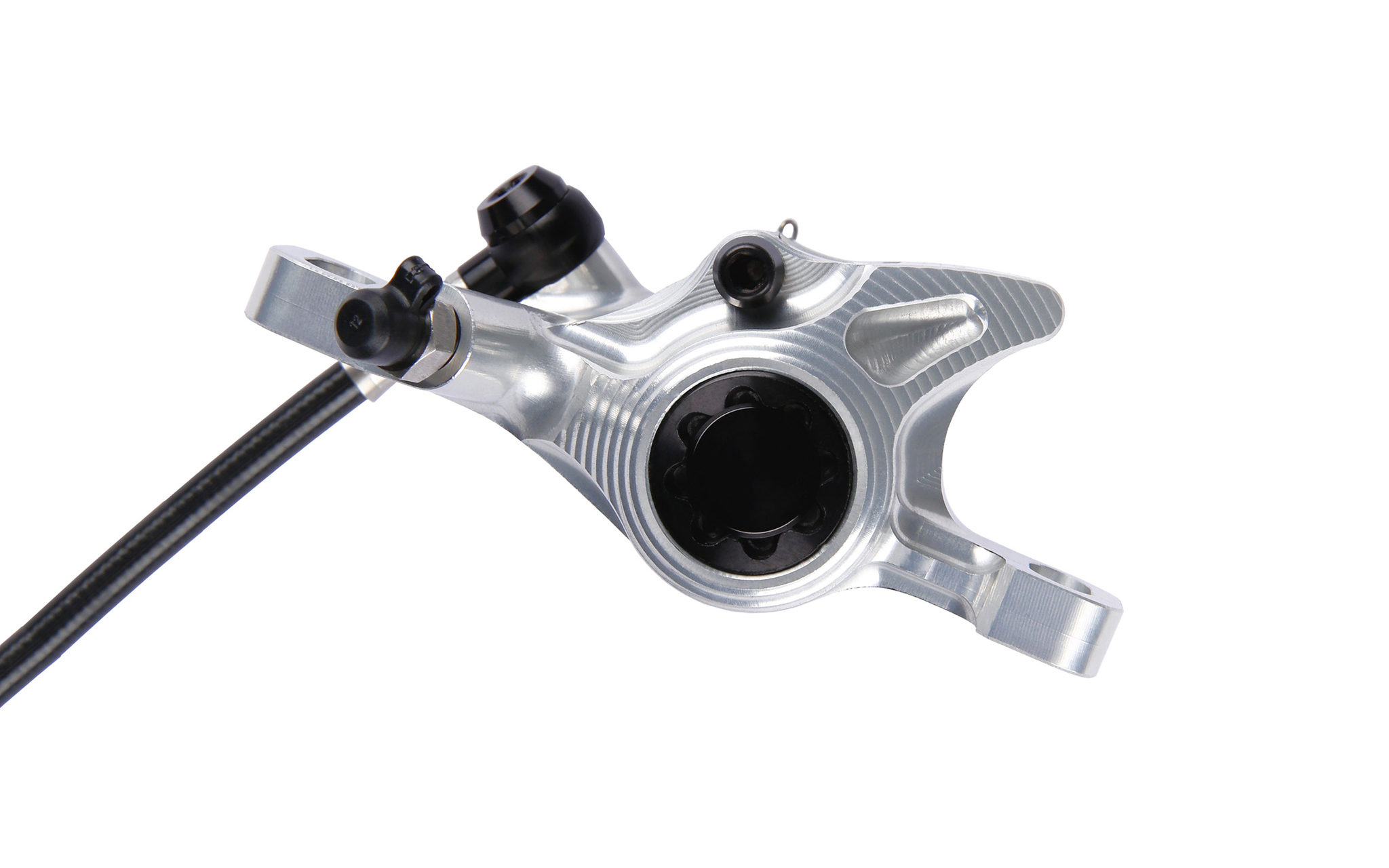 Ce bloc levier est associé à une version modifiée de l’étrier des Tech3 X2 (les freins de XC actuels de Hope), avec des plaquettes dotées d’un support en aluminium et un connecteur plus fin.
