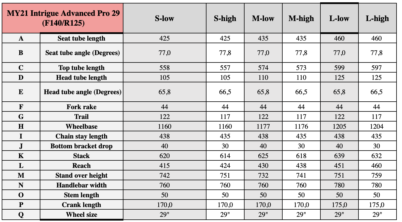- Intrigue Advanced Pro 2 29, 4 500 € : suspensions RockShox Pike Select et Deluxe Select+, transmission Sram NX Eagle avec plateau 30 dents, freins Shimano MT520 (4 pistons), roues Giant TRX-2, pneus Maxxis DHF 2.5/Dissector 2.4 et carcasse EXO