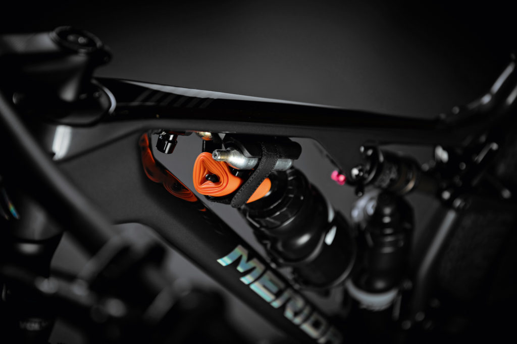 Dans sa version la plus haut de gamme (carbone CF5), le cadre est annoncé à 1 695 g en taille M, mais Merida ne précise pas si ce poids est mesuré avec ou sans amortisseur, ce qui fait une certaine différence. En version CF4/CF5, plus accessible mais plus lourde, il faut compter 150 g de plus.
