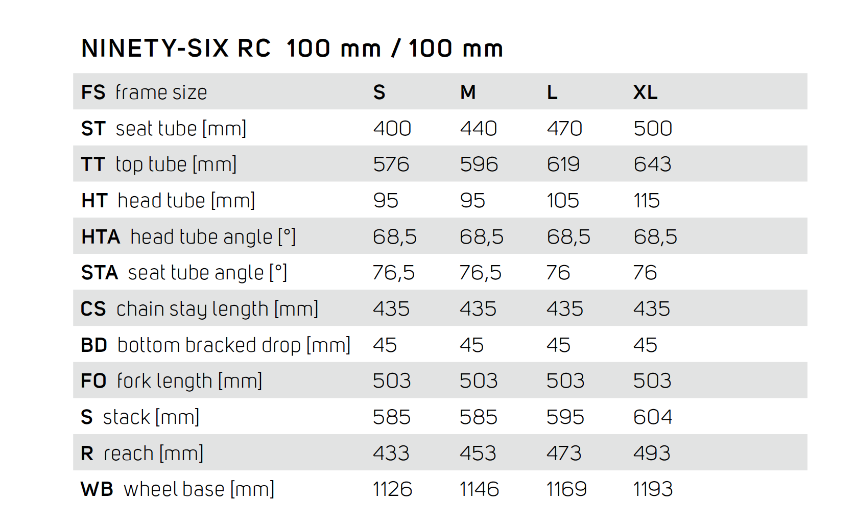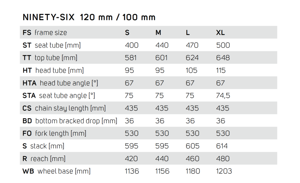 Pour la géométrie, on parlera bien de nouveauté et pas d’évolution tant elle n’a rien à voir avec celle des précédents Ninety-Six. L’angle de direction perd 1,5° (68,5°), l’angle du tube de selle gagne 1,5° à 2° suivant la taille (76,5° en S et M, 76° en L et XL) et le reach s’allonge de 24 à 25 mm (453 mm en taille M) tandis que le tube supérieur ne bouge presque pas (+6 mm en M, -4 mm en L, -3 mm en XL).