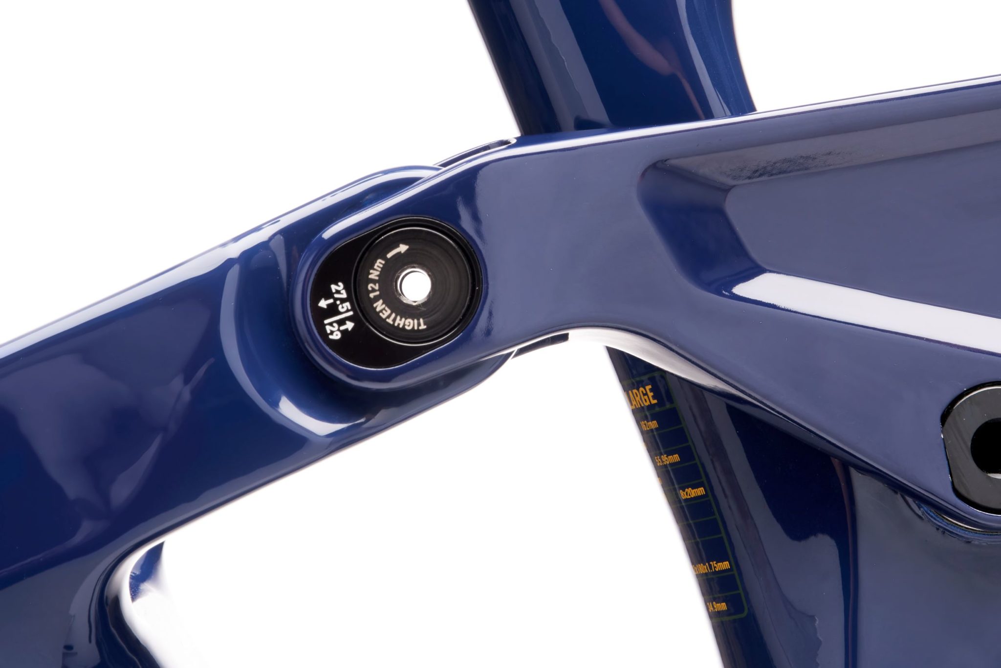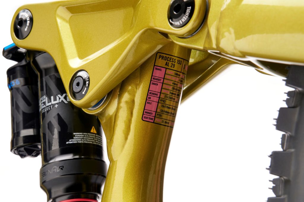 Détail intéressant, toutes les données utiles sur les différents standards et interfaces du vélo (format du boîtier de pédalier, du jeu de direction, taille des roulements de suspension, dimensions de l’amortisseur, référence de la patte de dérailleur…) sont indiquées sur le vélo, à l’arrière du tube de selle. Voilà qui devrait simplifier la vie des propriétaires au moment de faire l’entretien de la machine ou de changer une pièce.