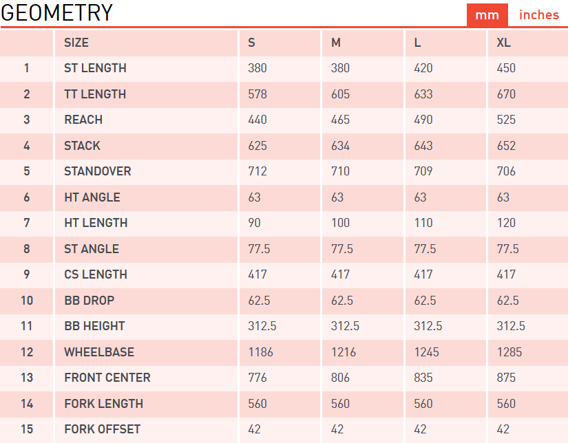 Le vélo est équipé d’une fourche en 150 mm de débattement et selon Kona, la géométrie s’inspire du Process X. On retrouve en effet les mêmes valeurs d’angle de direction (63,5°), de reach (465 mm en taille M), de longueur de bases (435 mm) ou encore de longueur de tube de selle (380 mm en taille M ce qui permet de monter facilement une tige de selle en 170-180 mm), ainsi qu’un angle de tube de selle très proche (77,5° contre 77,9°).