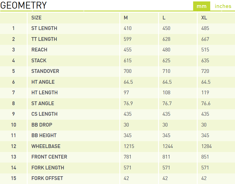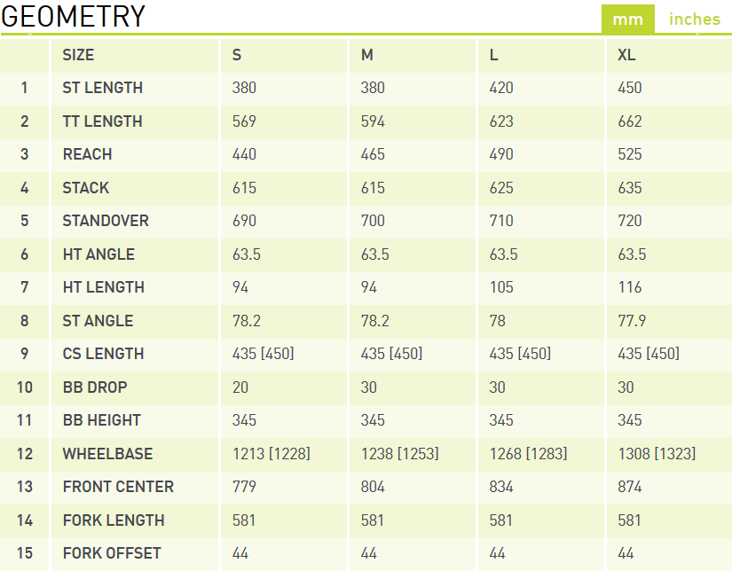 La géométrie se veut résolument tournée vers la descente avec un angle de direction couché (63,5°) et un reach long (465 mm en taille M). Comme bien souvent aujourd’hui, ces cotes sont associées à un angle de tube selle droit (entre 77,9° et 78,2° selon la taille) pour conserver une position suffisamment centrée au pédalage et ne pas avoir l’impression d’être assis sur la roue arrière, tandis que le tube de selle est court pour autoriser le montage d’une tige de selle télescopique à grand débattement.