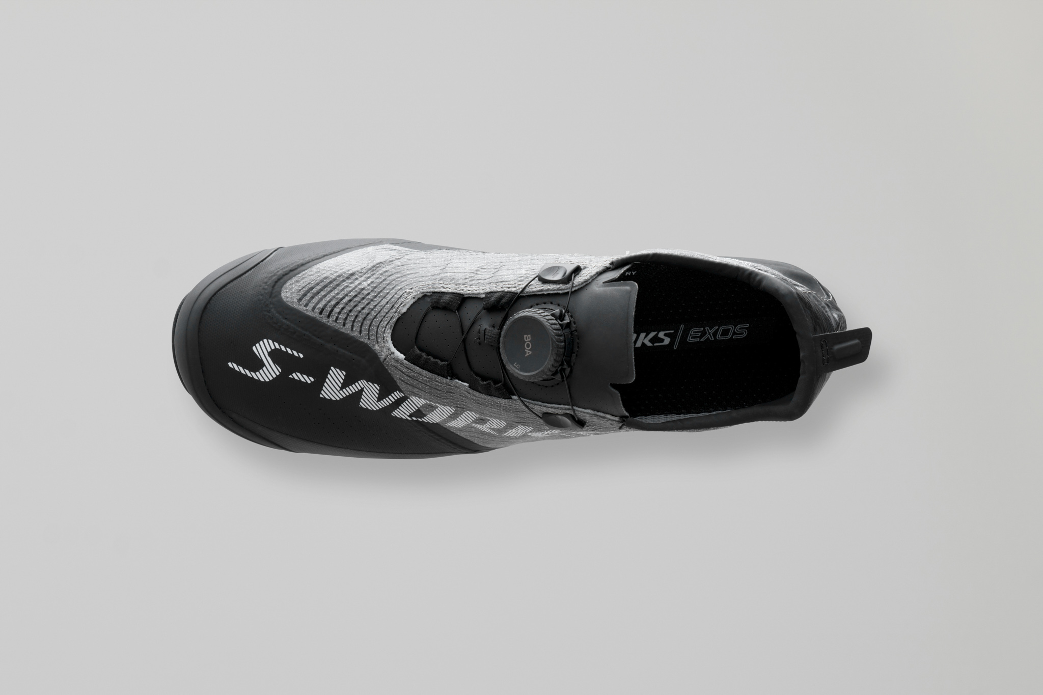 On remarque que le laçage ne va pas très loin sur l’avant de la chaussure. De quoi se poser quelques questions quant au maintien de l’avant-pied dans les efforts importants (sprint, relance, danseuse en montée raide…), d’autant que c’est aussi le point faible de la S-Works Exos de route. A tester sur le terrain !
