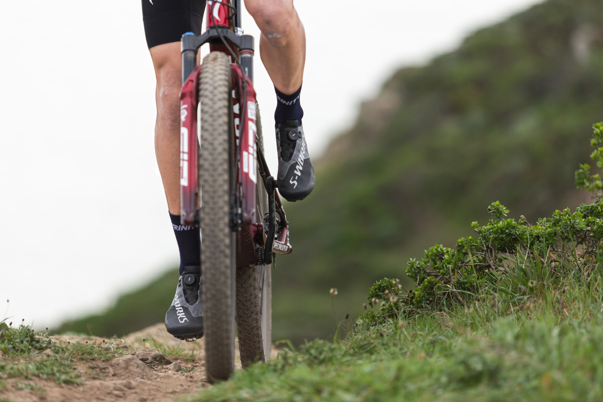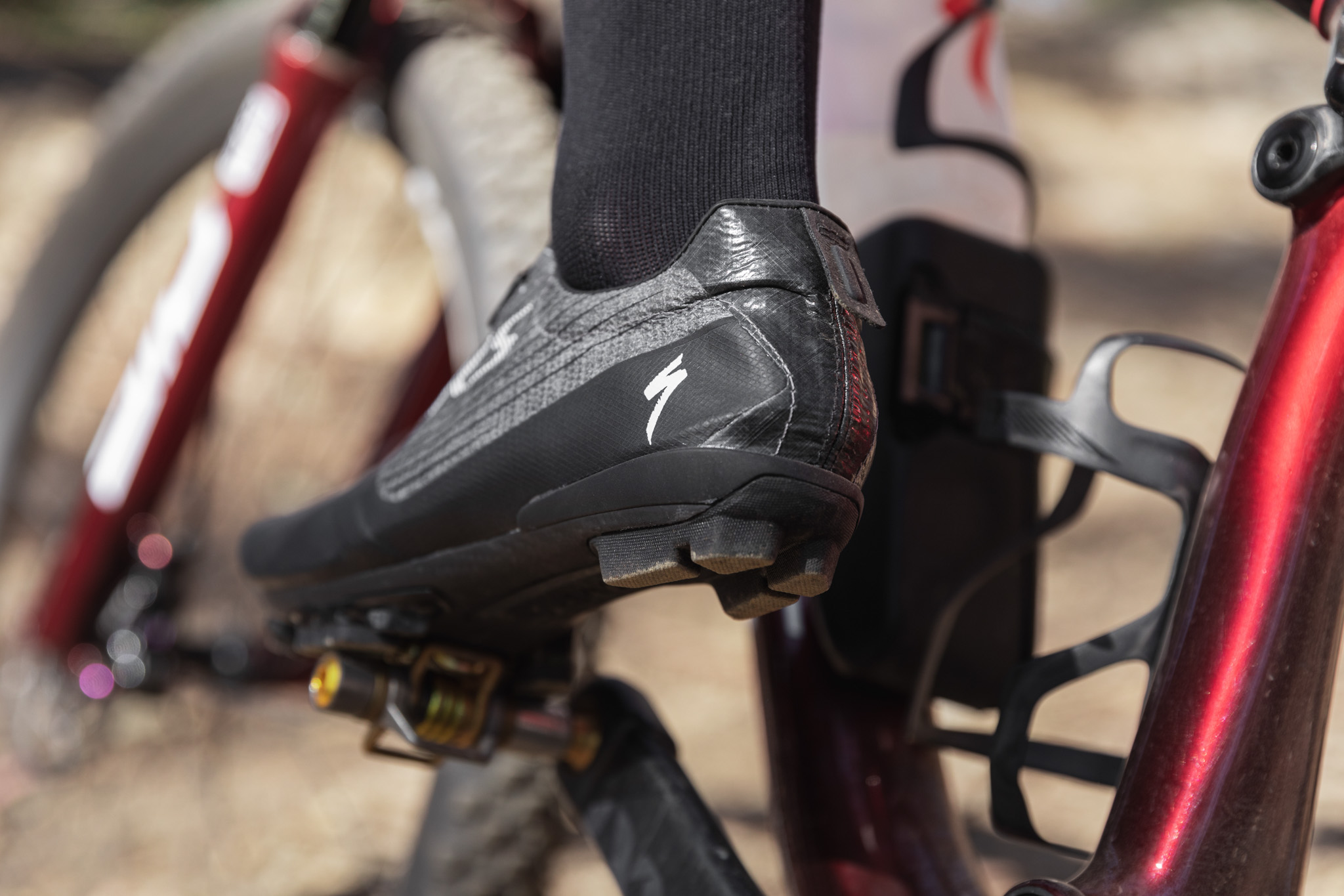 En VTT, les caractéristiques qu’on attend d’une chaussure (crampons en caoutchouc pour pousser/porter le vélo, résistance aux rochers, aux branches…) font qu’il est impossible de descendre aussi bas, mais Specialized voulait tout de même voir ce qu’il était possible de faire, jusqu’où il était possible d’aller en conservant la polyvalence nécessaire.