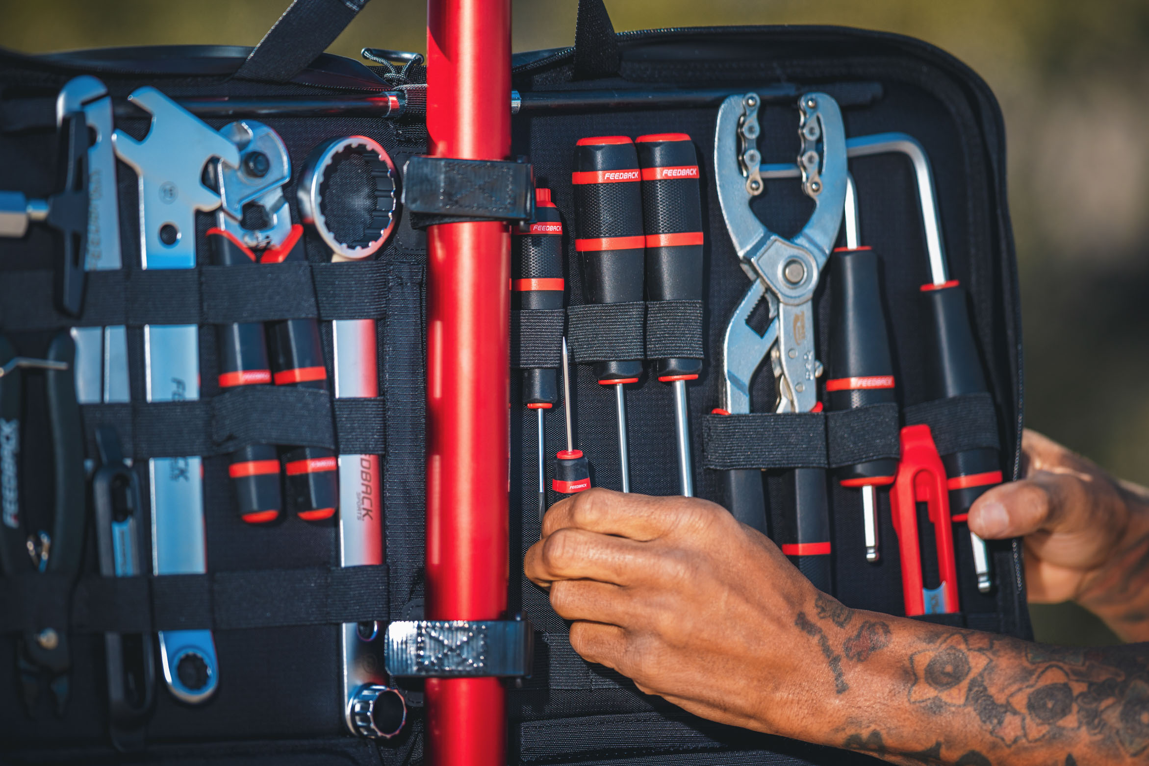 Pour accompagner ce pied d’atelier Pro Mechanic, le catalogue de Feedback Sports prévoit une mallette à outils très complète, « venant s’attacher directement au niveau de la zone de travail afin de toujours avoir ses outils à portée de main », précise la marque.
