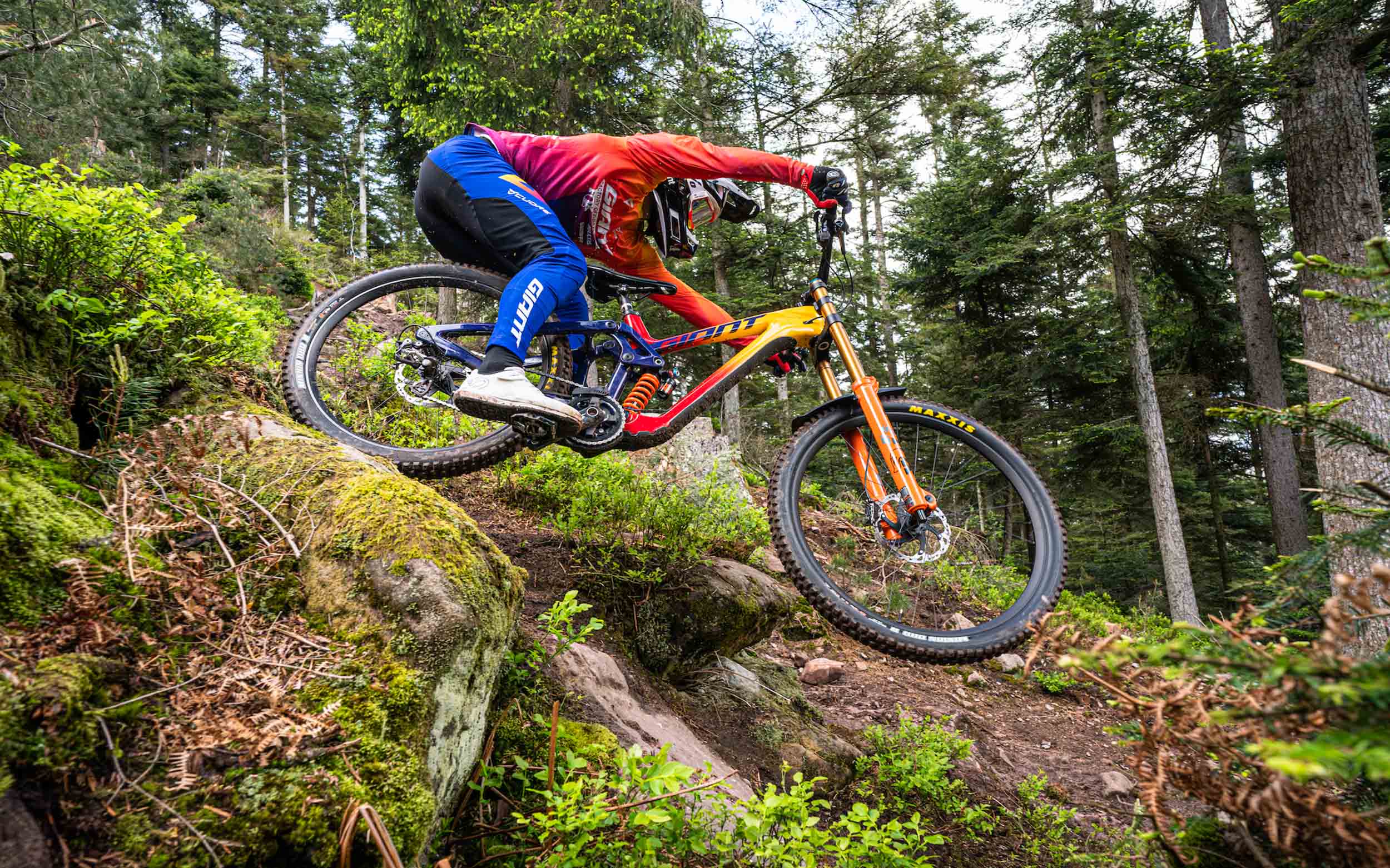 « En signant chez Giant, mon engagement était autant sur la performance que le développement. Le projet Glory était déjà lancé, mais en 29″ uniquement. J’ai insufflé l’idée du montage mulet pour avoir un vélo adapté à mon gabarit. Cela a nécessité de repenser toutes les géométries », explique Rémi Thirion. Cette nouvelle version du Glory permet ainsi de choisir entre un montage en roues de 29″ ou un montage dit « mulet », à savoir une roue de 29″ à l’avant combinée à une roue de 27,5″ à l’arrière.