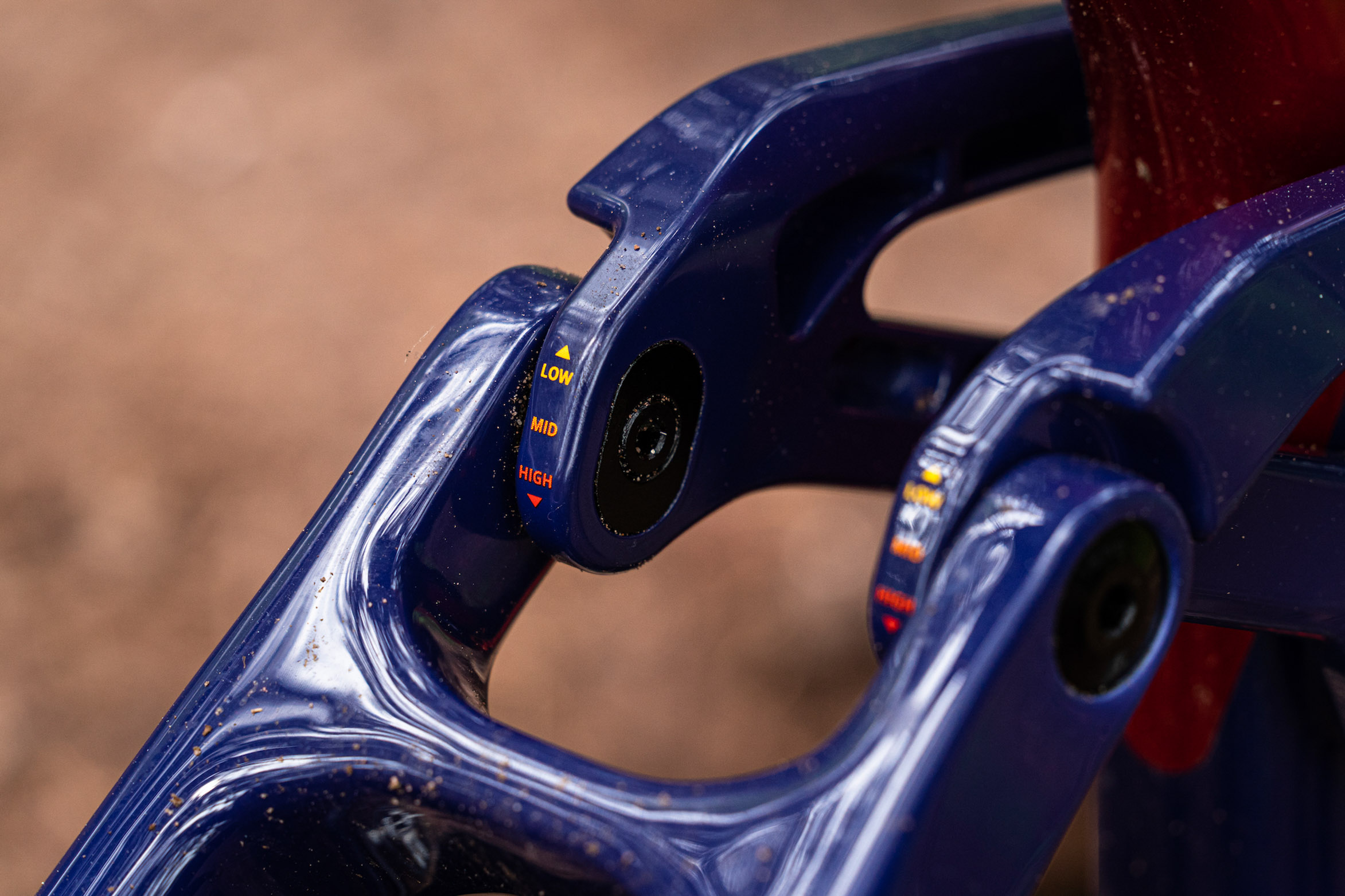 Le premier d’entre eux, situé sur la biellette supérieure, offre trois choix de position. Outre la position intermédiaire dite « neutre », la position haute permet de refermer les angles de direction et de tube de selle ainsi que de relever le boîtier de pédalier, tandis qu’à l’inverse, la position basse ouvre les angles précités pour offrir davantage de stabilité à haute vitesse.
