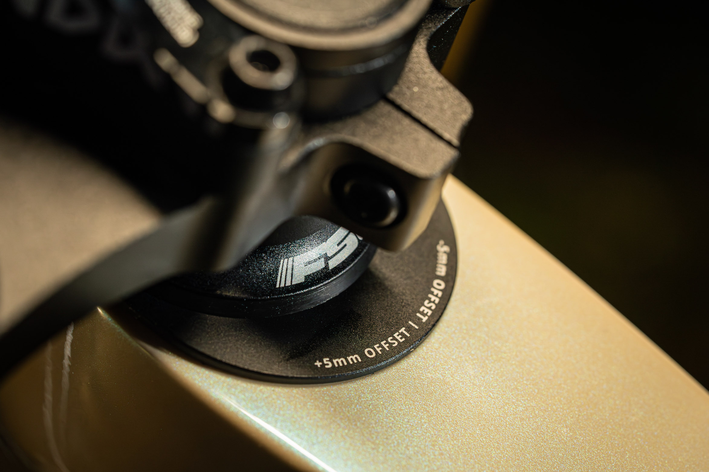 On retrouve également un flip-chip au niveau de la douille de direction, offrant trois positions possibles, à savoir un offset de -5mm, de 0mm ou de +5mm. De manière moins abstraite, ces trois positions se traduisent sur le terrain par un vélo plus agile en position courte, plus stable en position longue et équilibré en position intermédiaire. Giant indique également que la position longue permet de « corriger la position du pilote dans une configuration mulet ». En montage mulet de série, le reach commence à 465 mm en taille M/L et peut donc varier de +/- 5 mm, pour atteindre 461 ou 469 mm.