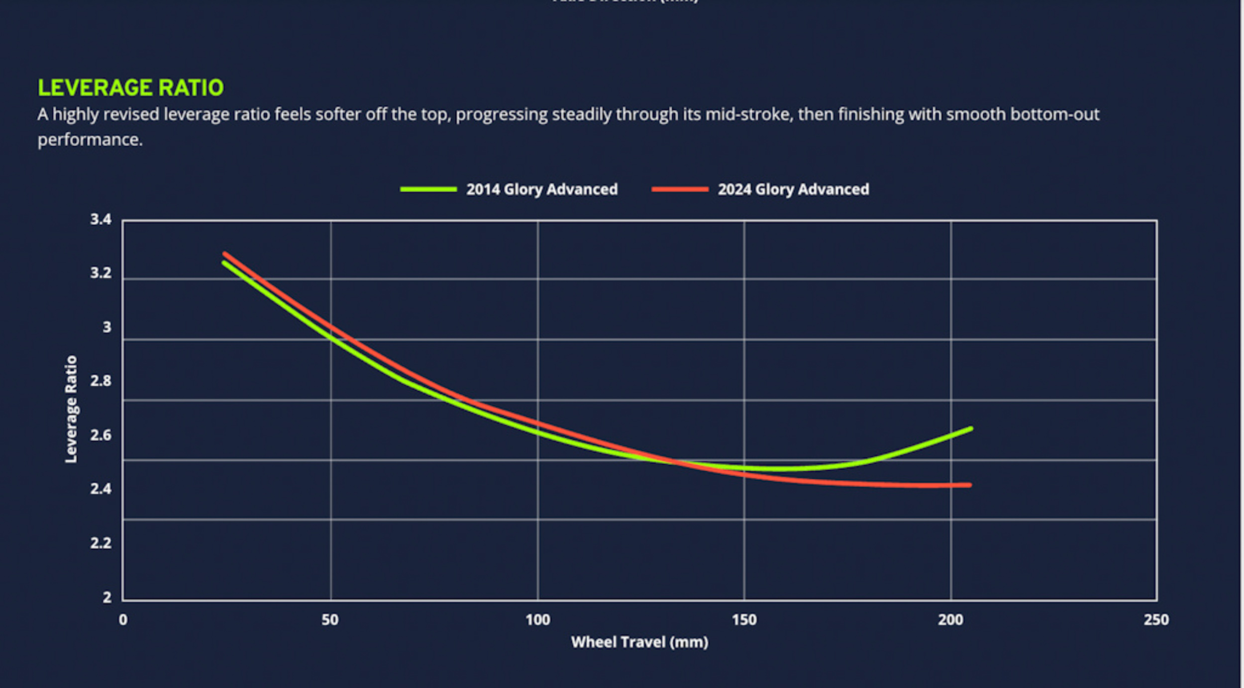Par rapport à la précédente génération, le Giant Glory 2023 se veut légèrement plus souple sur le début du débattement, tandis que la progressivité a été augmentée en fin de débattement. La marque américaine explique également que « l’anti-rise commence à 75 % et diminue lentement jusqu’à 60 %, ce qui devrait permettre à la roue arrière de rester active sans faire basculer le vélo vers l’avant en cas de freinage. En ce qui concerne l’efficacité du pédalage, l’anti-squat oscille autour de 80 % au SAG, soit un tiers du débattement. »