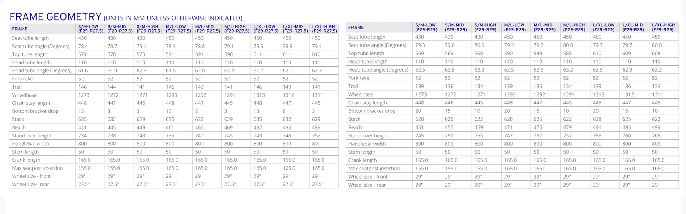 Si le Giant Glory n’est disponible qu’en trois tailles différentes (S/M, M/L et L/XL), le tableau de géométrie est pourtant bien chargé ! Cela s’explique, dans un premier temps par la possibilité de montage en roues de 29″ ou montage mulet, mais également par la présence de 3 flip-chips au sein du cadre de ce Glory, permettant d’ajuster la géométrie à ses préférences personnelles et/ou par exemple à la piste du week-end.