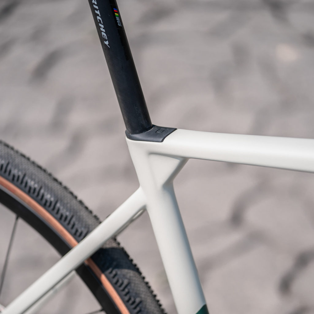 Outre les fixations habituels sur le tube diagonal ainsi que sur le tube de selle, la fourche se voit doter d’un oeillet de fixation supplémentaire par rapport à la précédente génération. On notera également qu’Origine a choisi de conserver exactement les mêmes sections de pneus compatibles à savoir maximum 700×45 et 650×47.