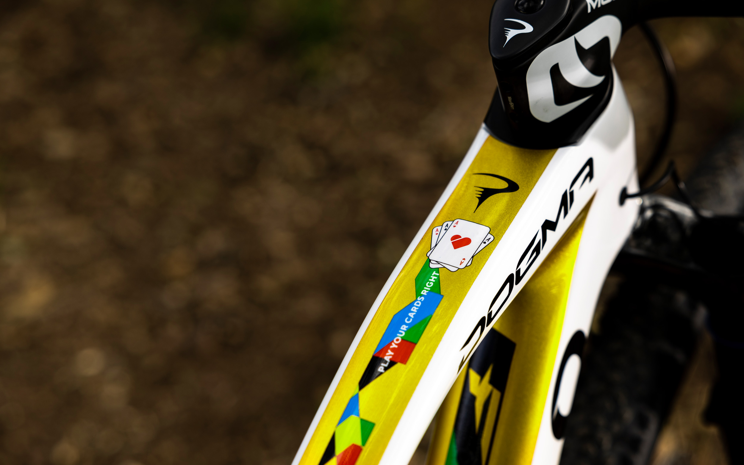 Le développement de ce Pinarello Dogma XC a débuté lors de l’automne 2022 avec l’étude des données issues de deux années précédentes de compétitions de Tom Pidcock, ainsi que des points que le pilote britannique jugeait nécessaires afin de concevoir un vélo capable de gagner sur la scène internationale. Le résultat en est un tout-suspendu au cadre en carbone et aux roues de 29″, à l’allure plutôt traditionnelle. Pourtant, ce Dogma XC présente quelques détails intéressants.