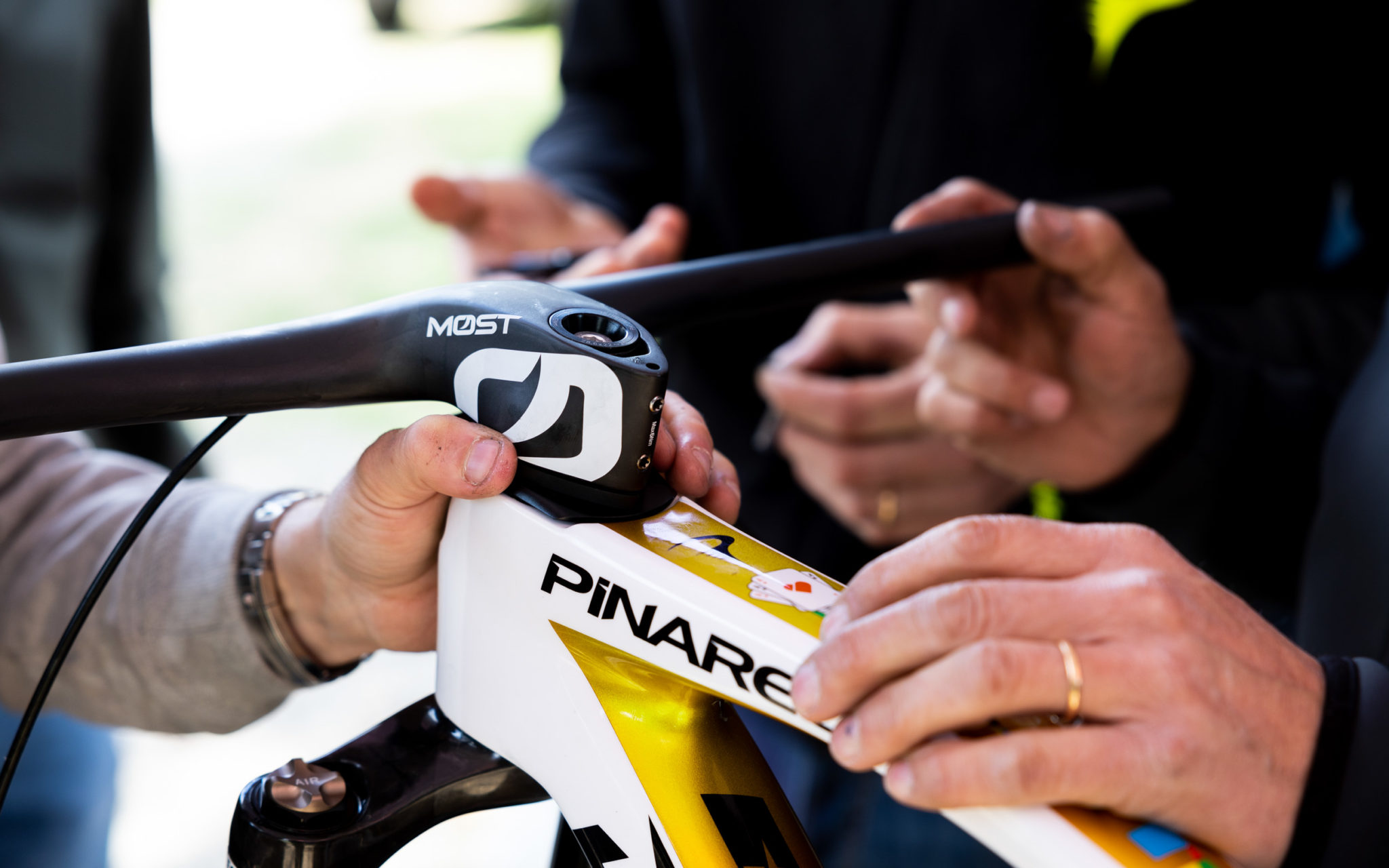 Au-delà du combo cintre-potence en une pièce, Pinarello joue également la carte de l’intégration au niveau du passage des câbles et Durits, qui se fait directement au sein du jeu de direction. Celui-ci est également doté de butées internes à 60° de chaque côté pour éviter que le cintre ne vienne abîmer le cadre en cas de chute.