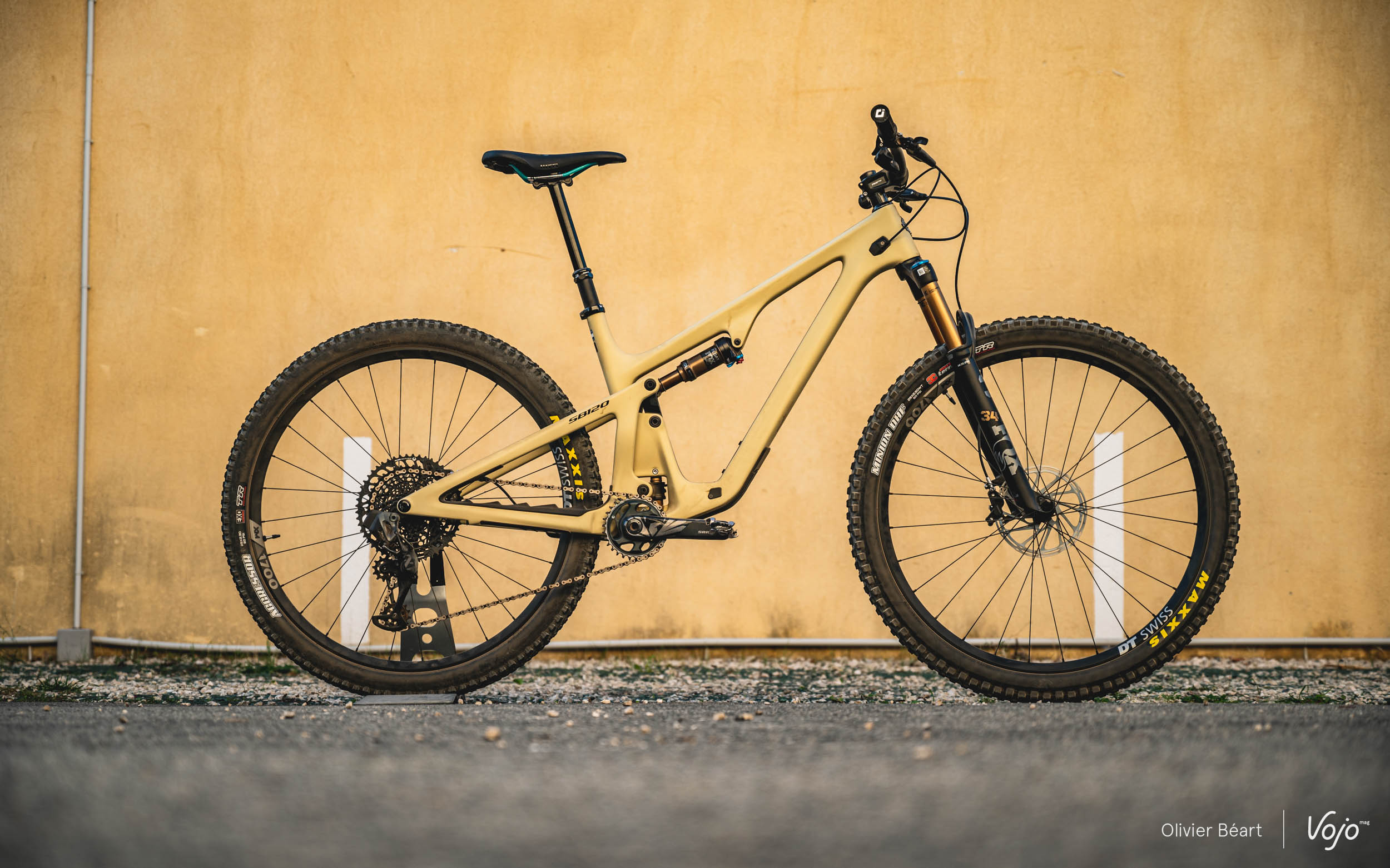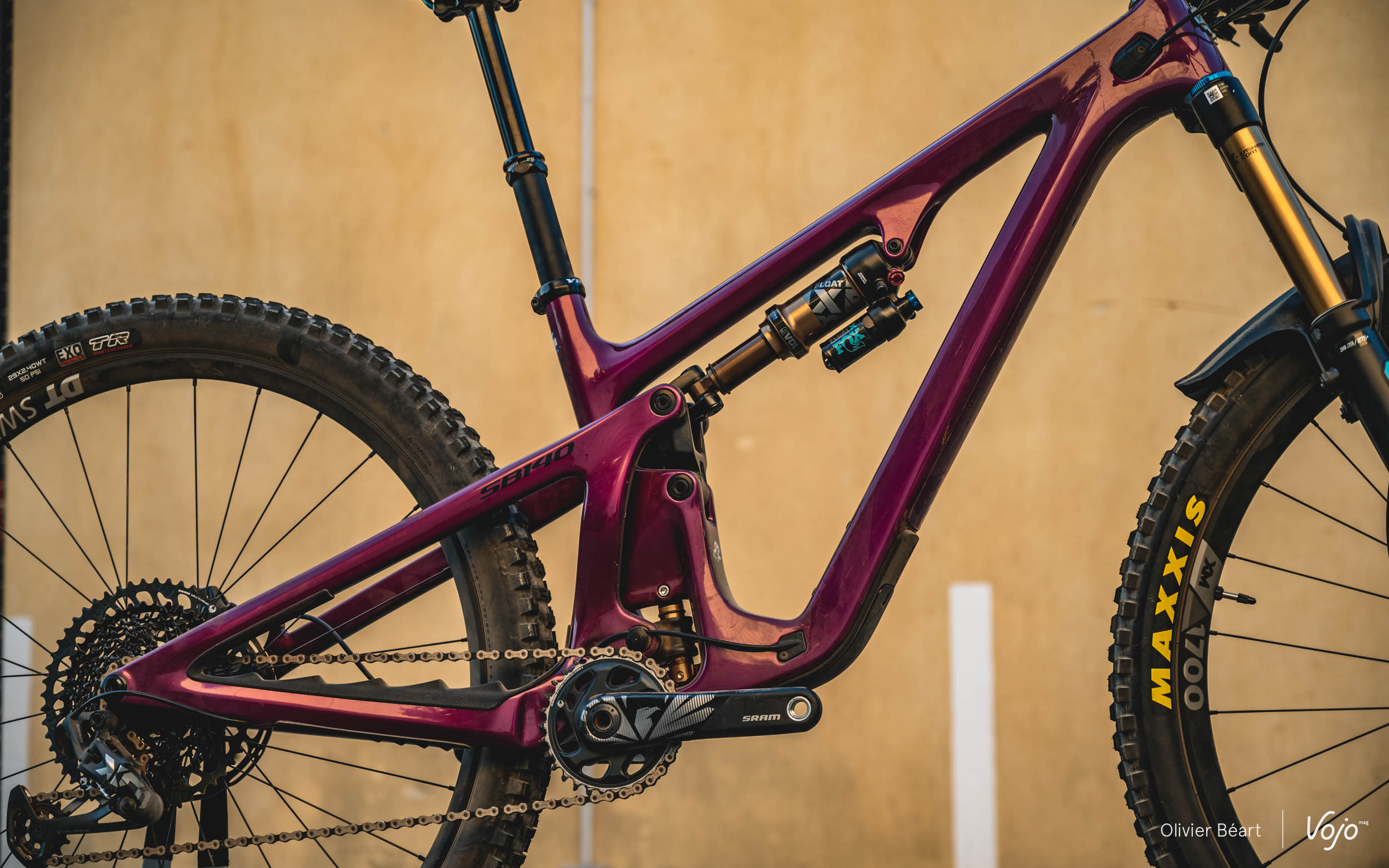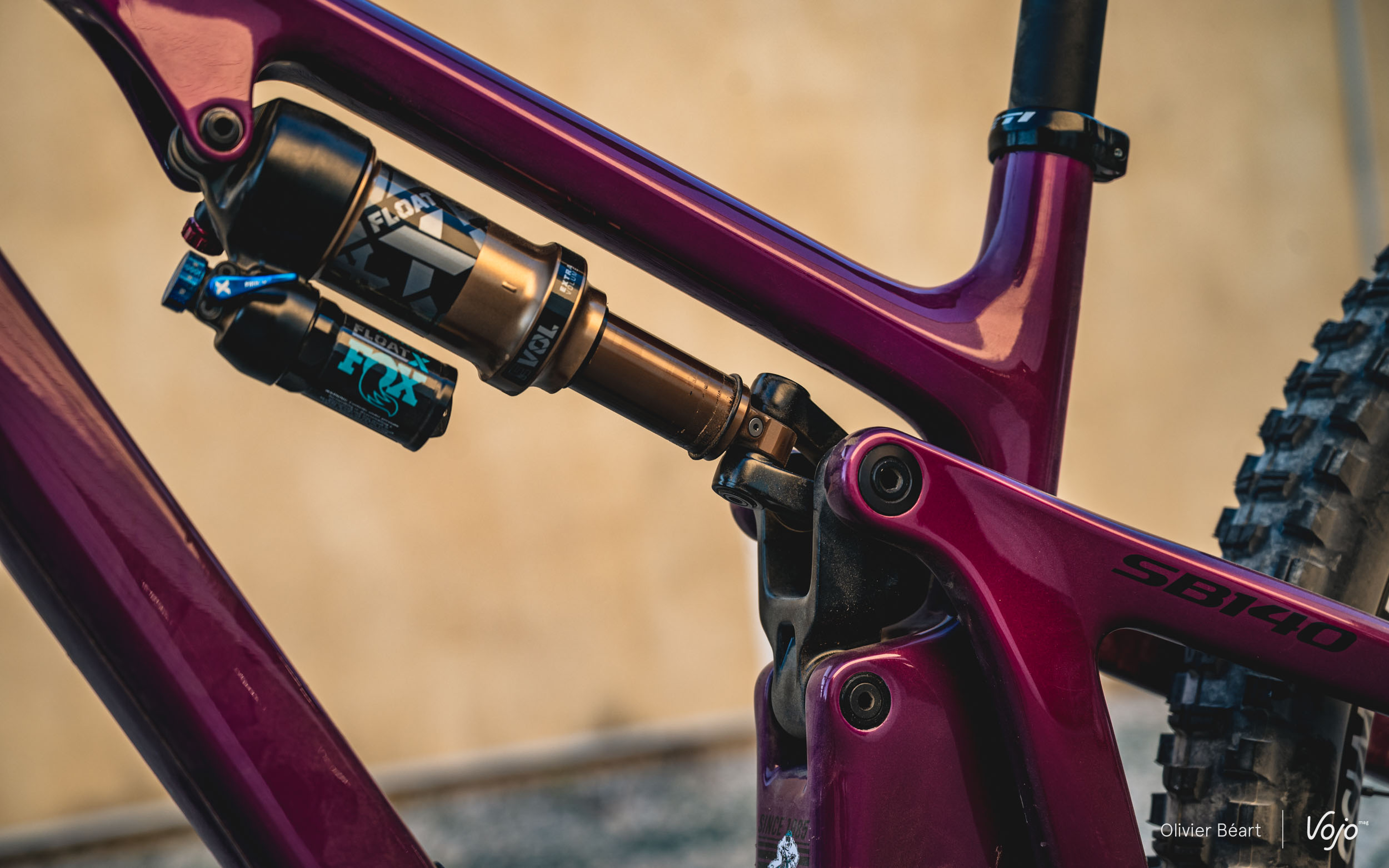 Comme son nom l’indique, il offre 140 mm de débattement arrière avec une suspension remaniée. Par rapport au SB160, la biellette est revue, le gros amortisseur Fox Float X2 cède la place à un DPX2 et l’évolution de la courbe de ratio est de 14 % contre 17 % sur le SB160.