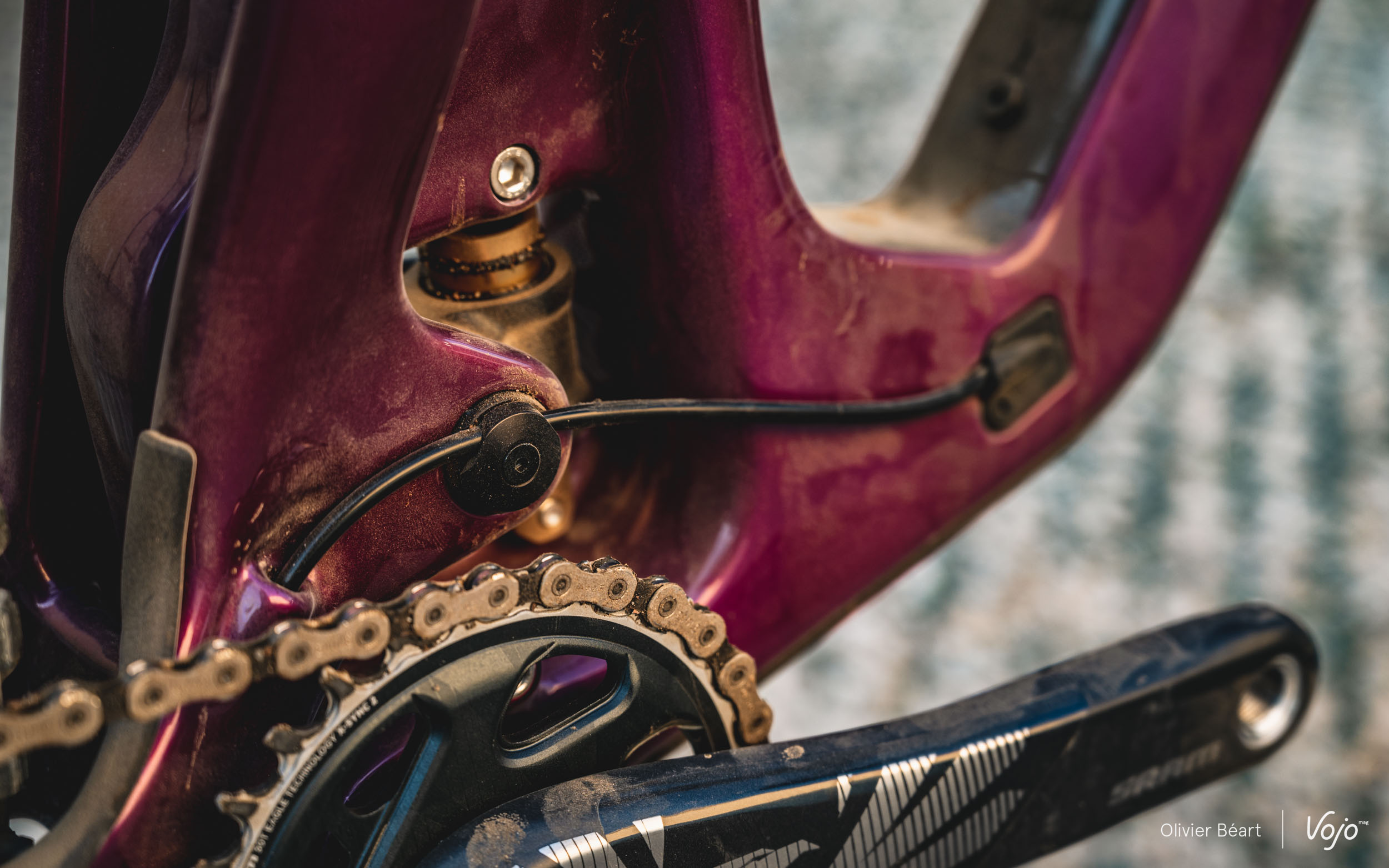 Le Yeti SB140 a aussi droit à un châssis repensé, avec une disposition revue des fibres de carbone pour une rigidité mieux dosée, et un tube diagonal repensé pour offrir plus de dégagement à l’approche du boîtier de pédalier, ce qui limite les risques de contact avec le sol. Si jamais cela devait arriver et/ou pour les projections de cailloux, il a droit aussi à une imposante protection (remplaçable) à cet endroit stratégique. Le boîtier de pédalier est désormais fileté et on trouve aussi des inserts ISCG05 pour anti-dérailleur.