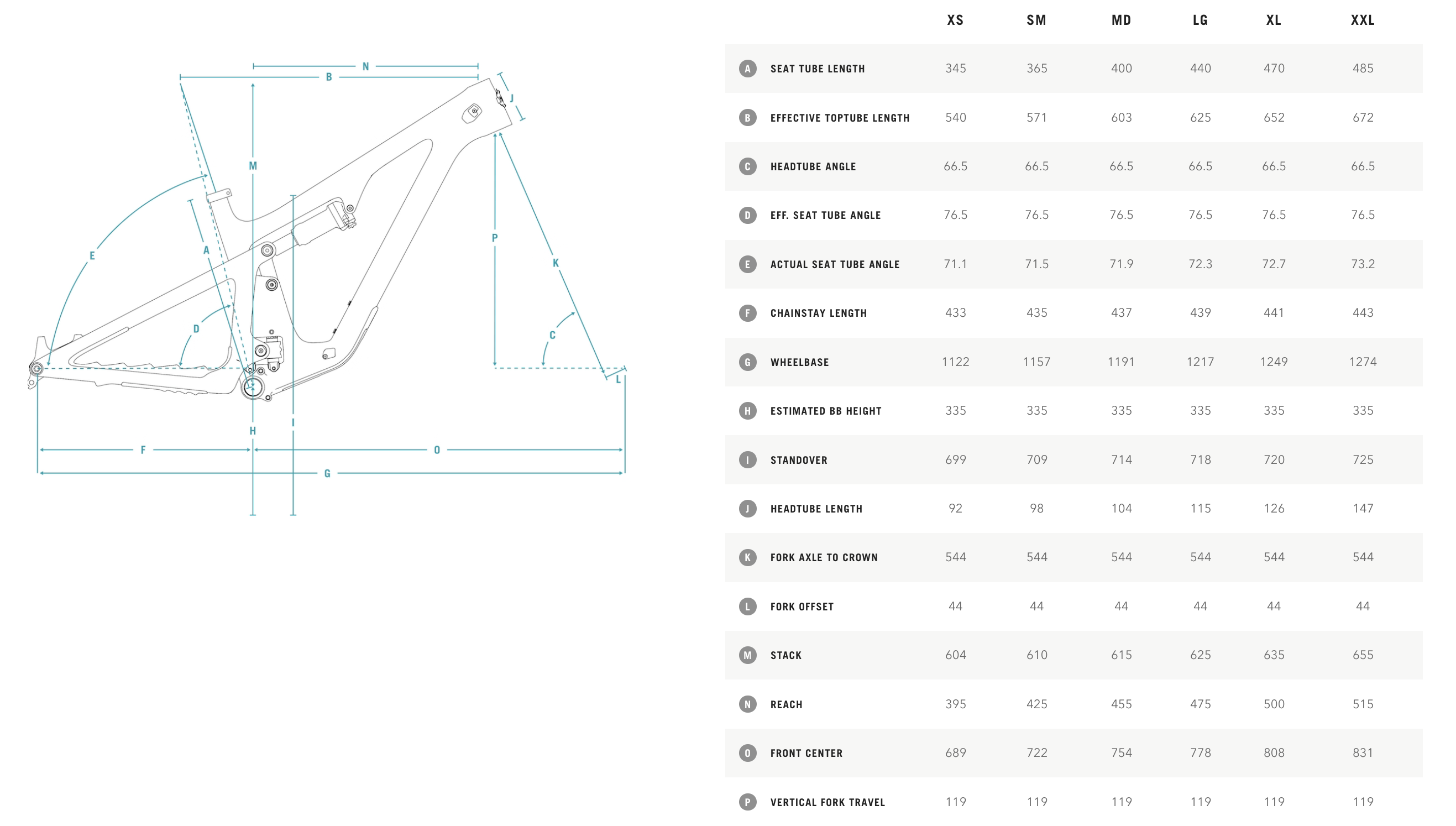 La géométrie est également parlante, avec un angle de direction à 66,5°. A noter qu’il y a ici 6 tailles au programme, du XS jusqu’au XXL.