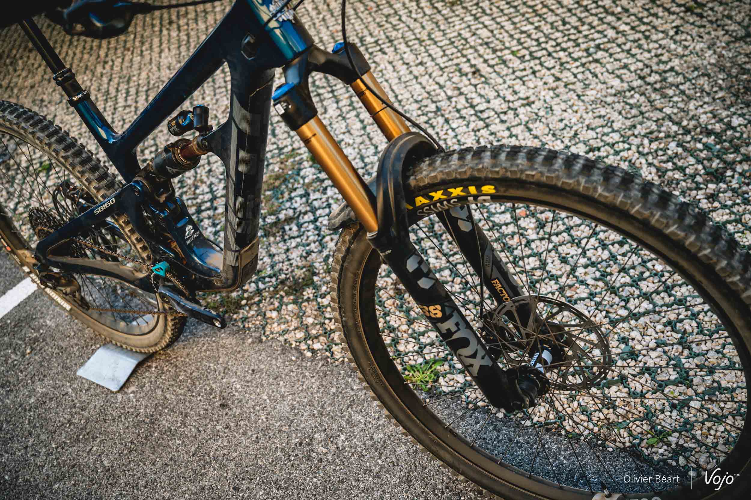 La courbe de ratio évolue désormais de 17% au fil du débattement. La biellette (montée sur des roulements plus imposants et des axes auto-centreurs) et aussi le tuning de l’amortisseur Fox Float X2 (en 205x65mm) évoluent également pour se mettre au diapason.